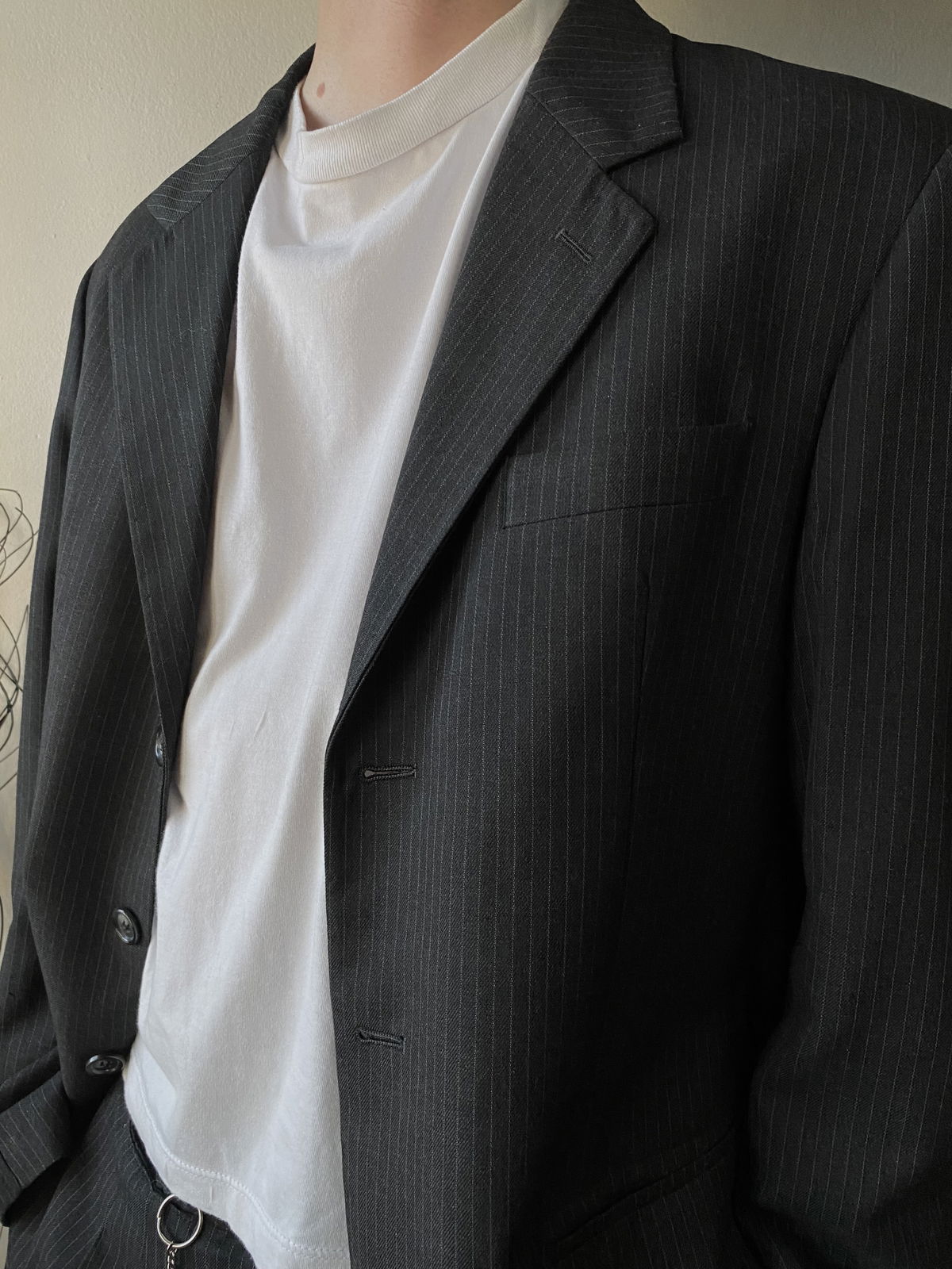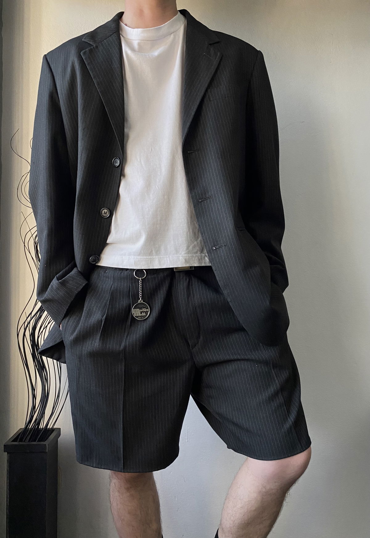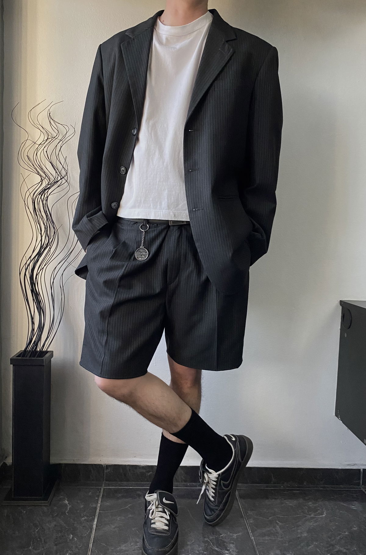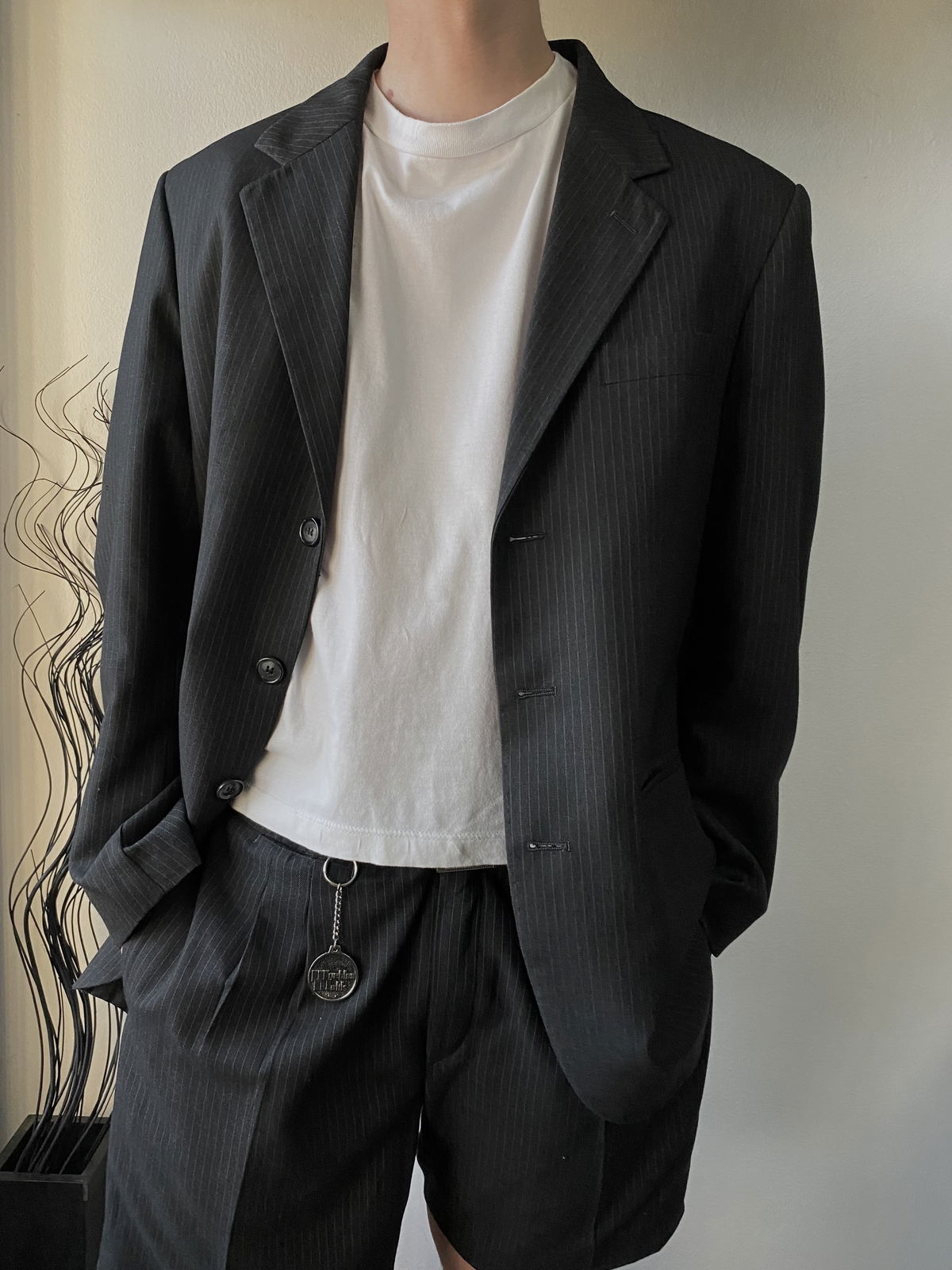 Traje sastrero color negro con finas líneas en color blanco. El blazer todo forrado por dentro, bolsillos reales en ambos lados y uno interior, pequeñas hombreras que pueden ser retiradas; la bermuda viene con bolsillos reales en ambos lados y atras, pasacinto y llavero metalico para darle un toque. Oversize, cómodo