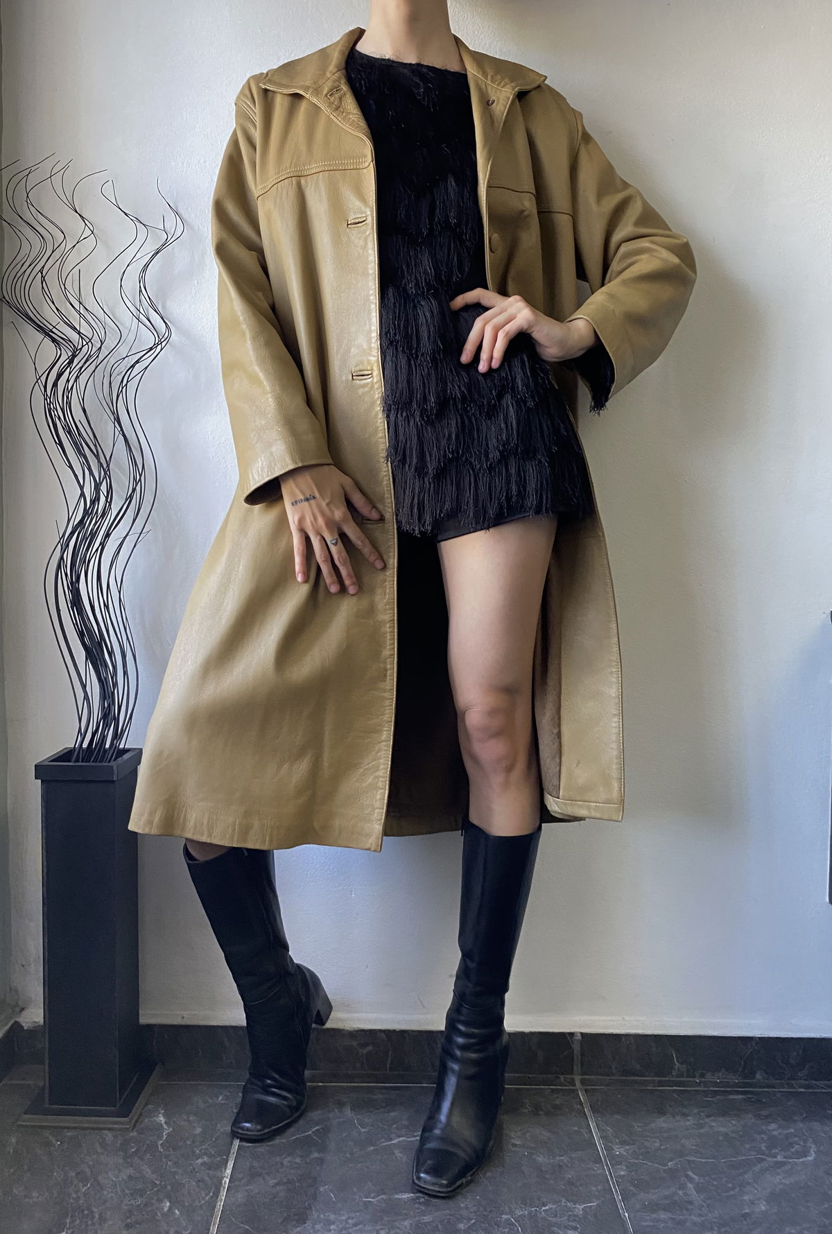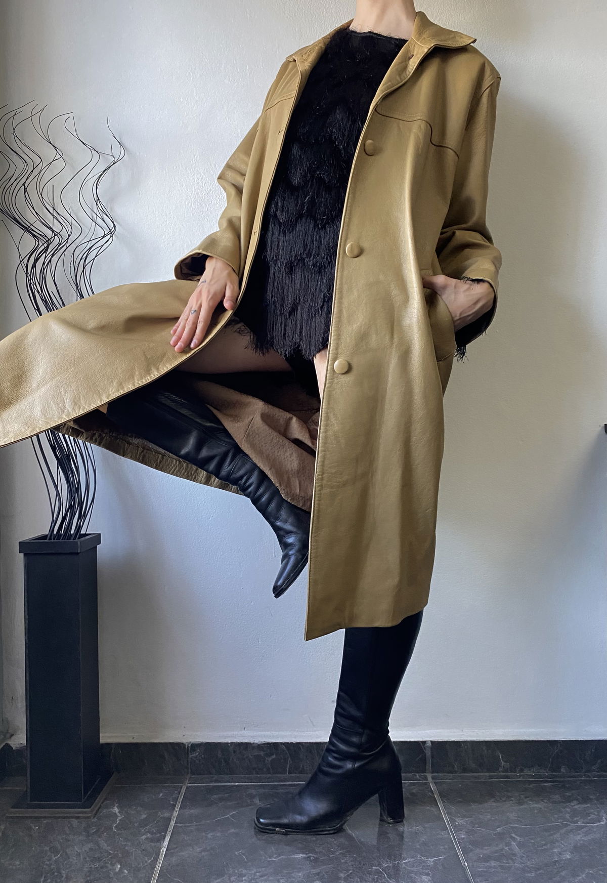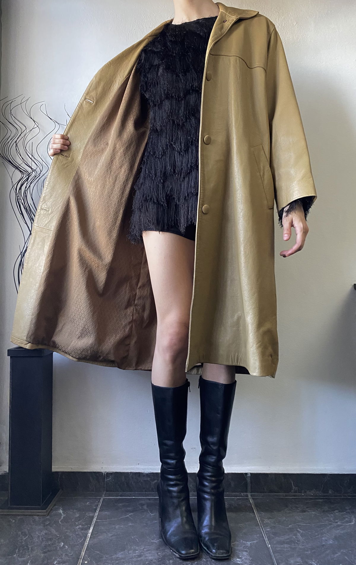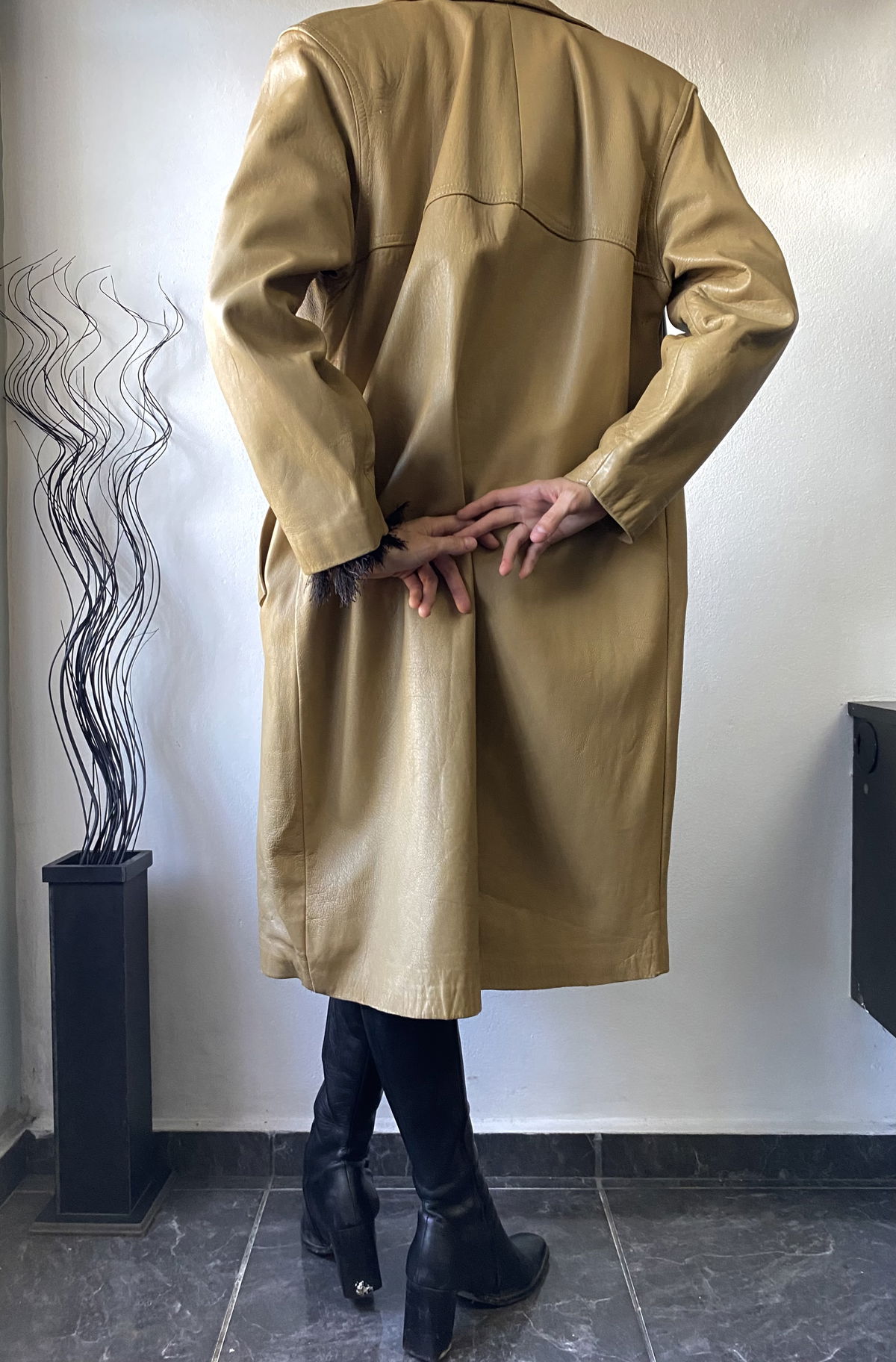 Tapado de ecocuero color crema, largo con bolsillos reales en ambos lados y todo forrado por dentro. Sin detalles, impecable, una joya vintage.