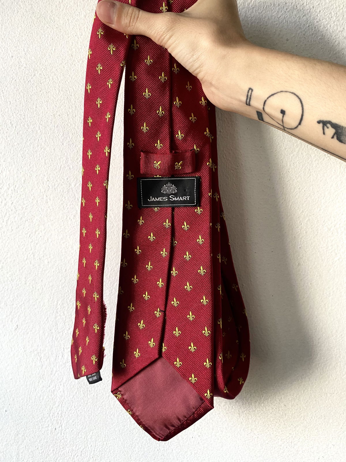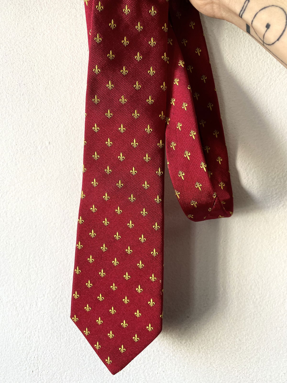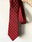 Corbata color roja estilo universitaria con mini logos amarillos, seda semi opaca.