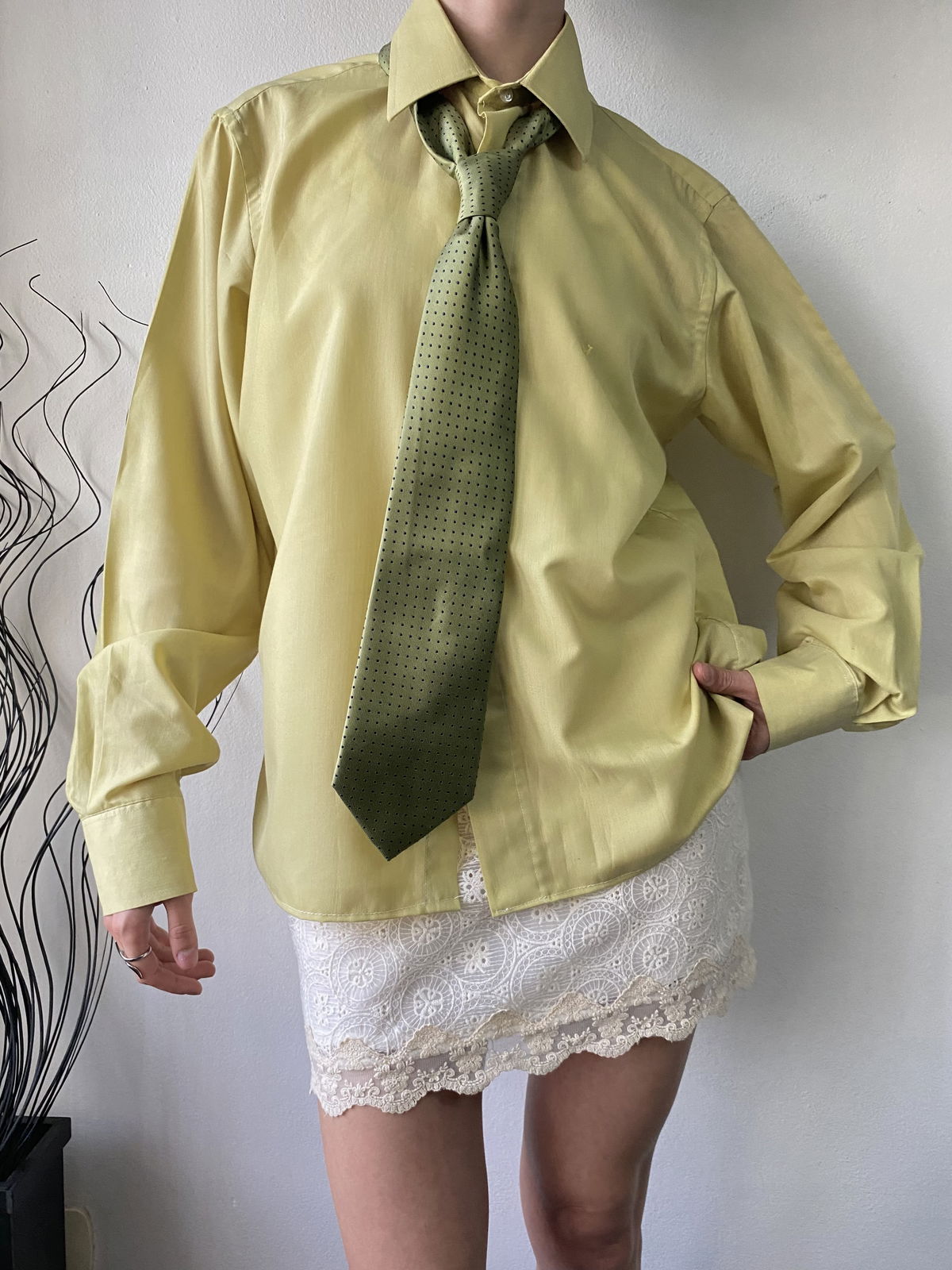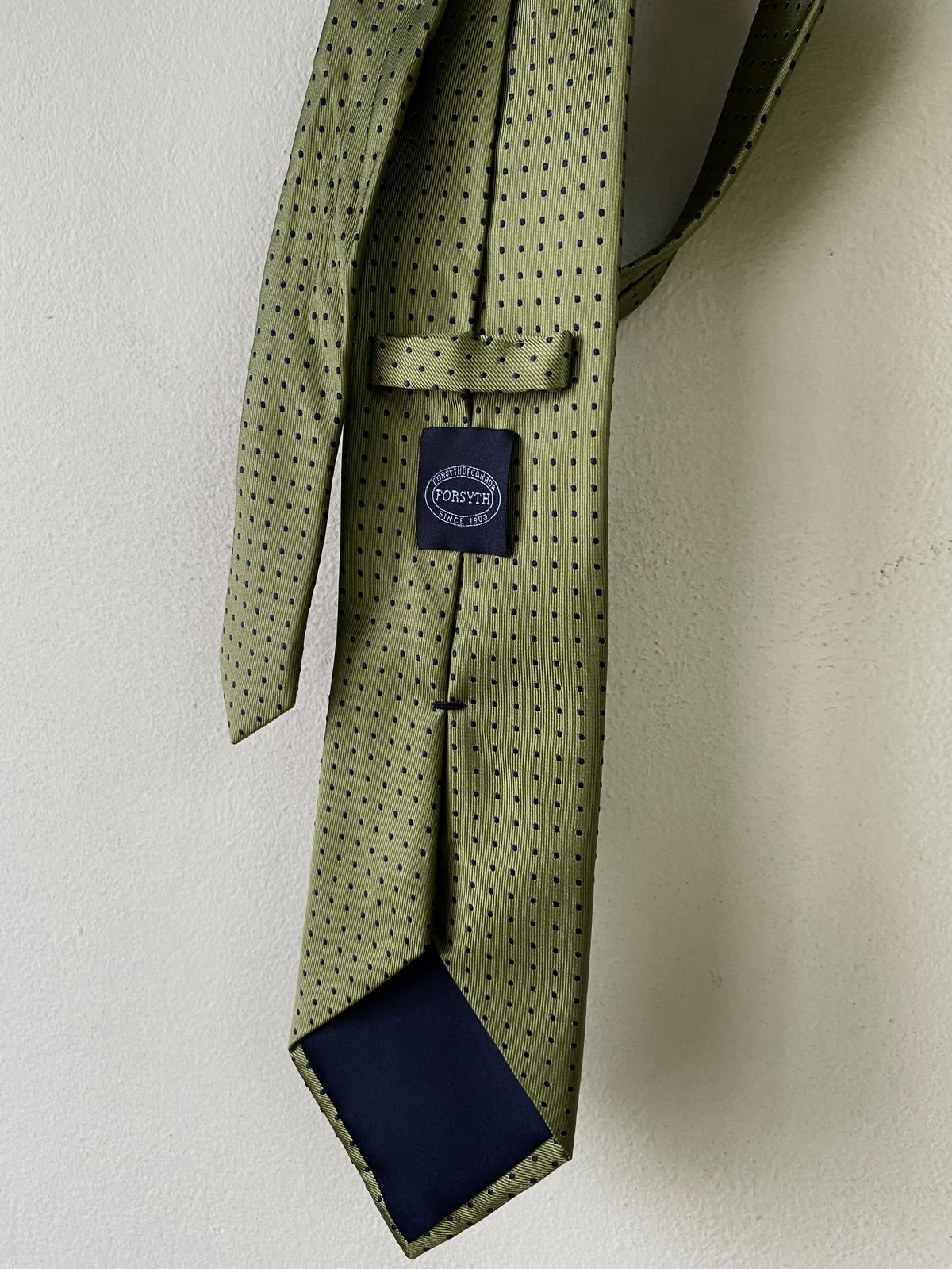 Corbata color verde lima con mini puntos en azul claro, seda opaca.