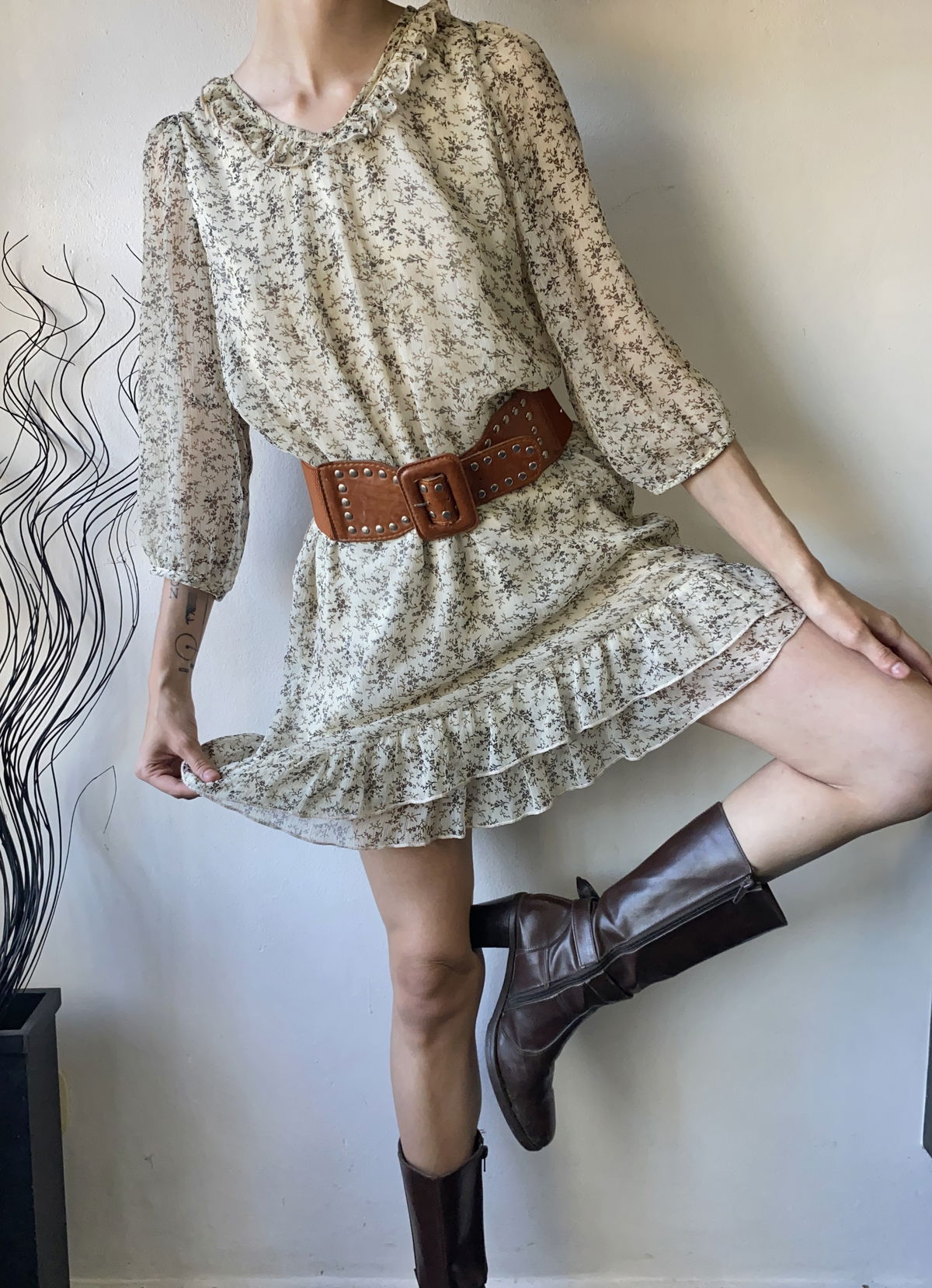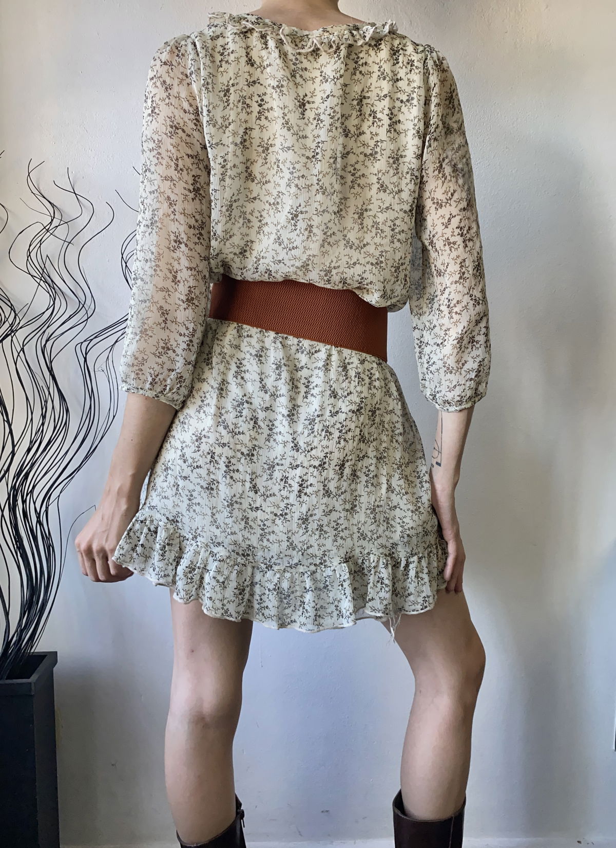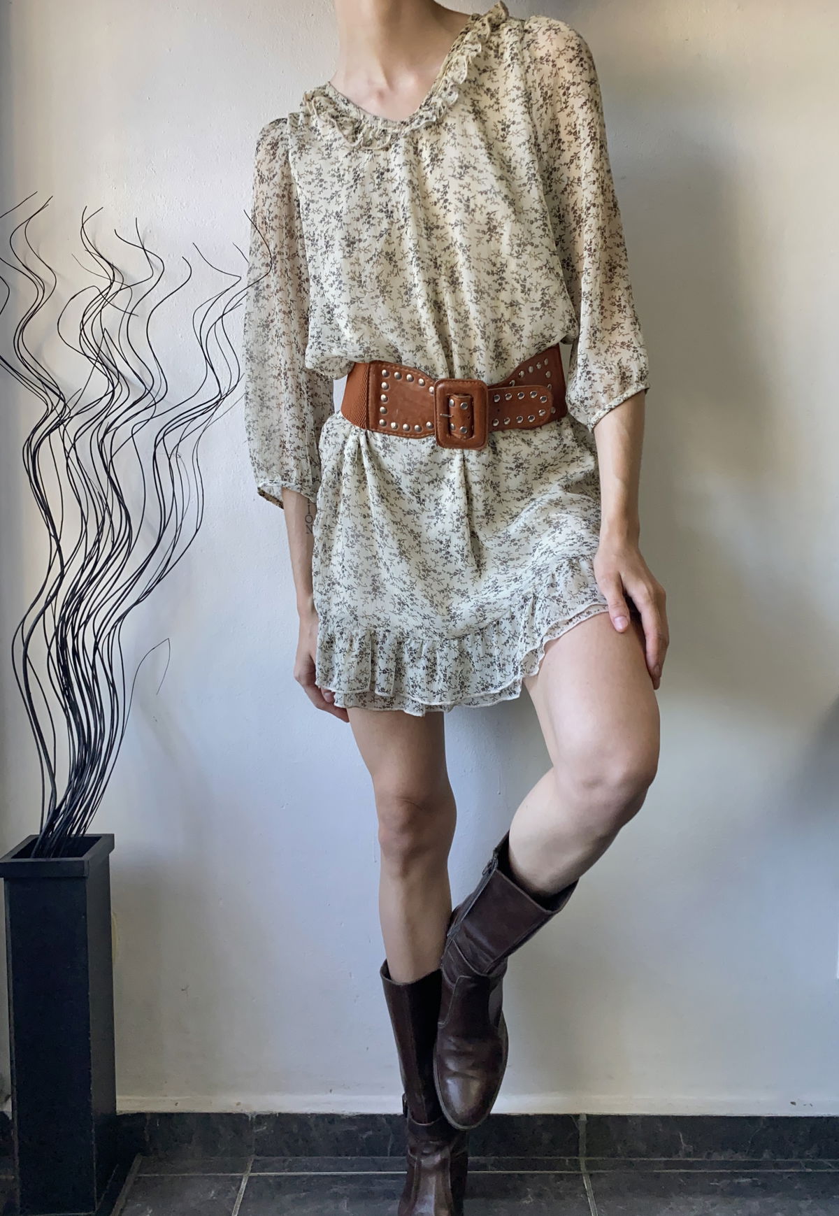 Vestido tipo boho chic con florcitas, manga con frunce y volados en el cuello y en la pollera. Todo forrado por dentro, no se transparenta y es súper liviano.