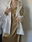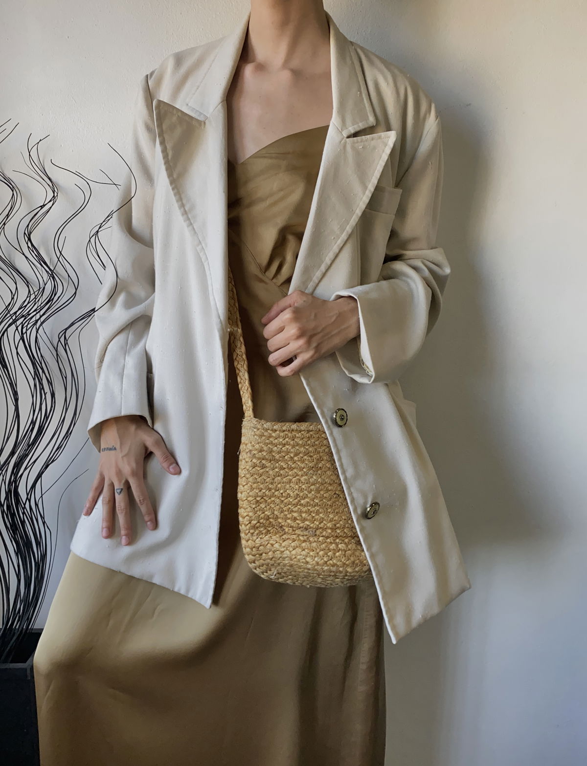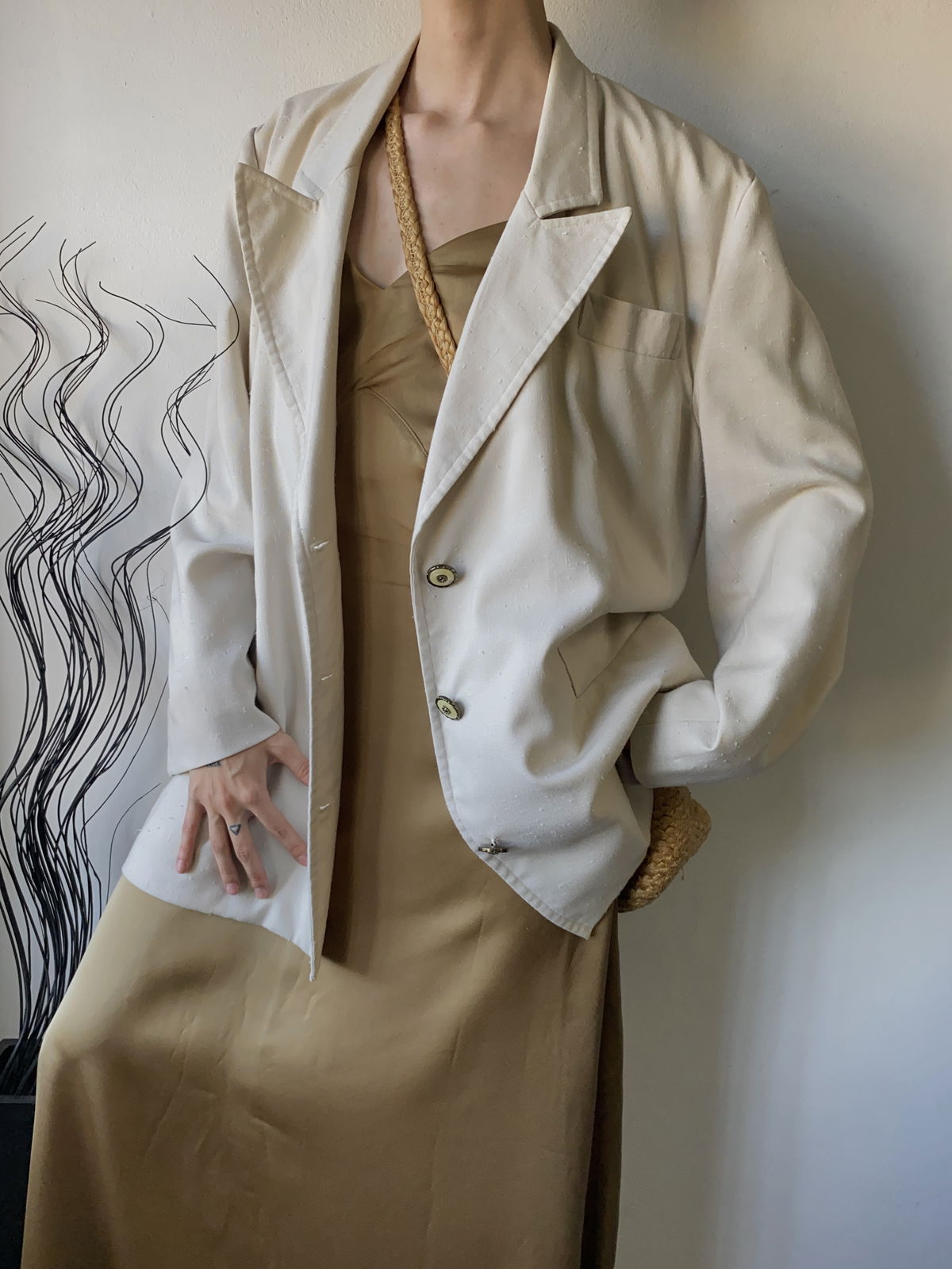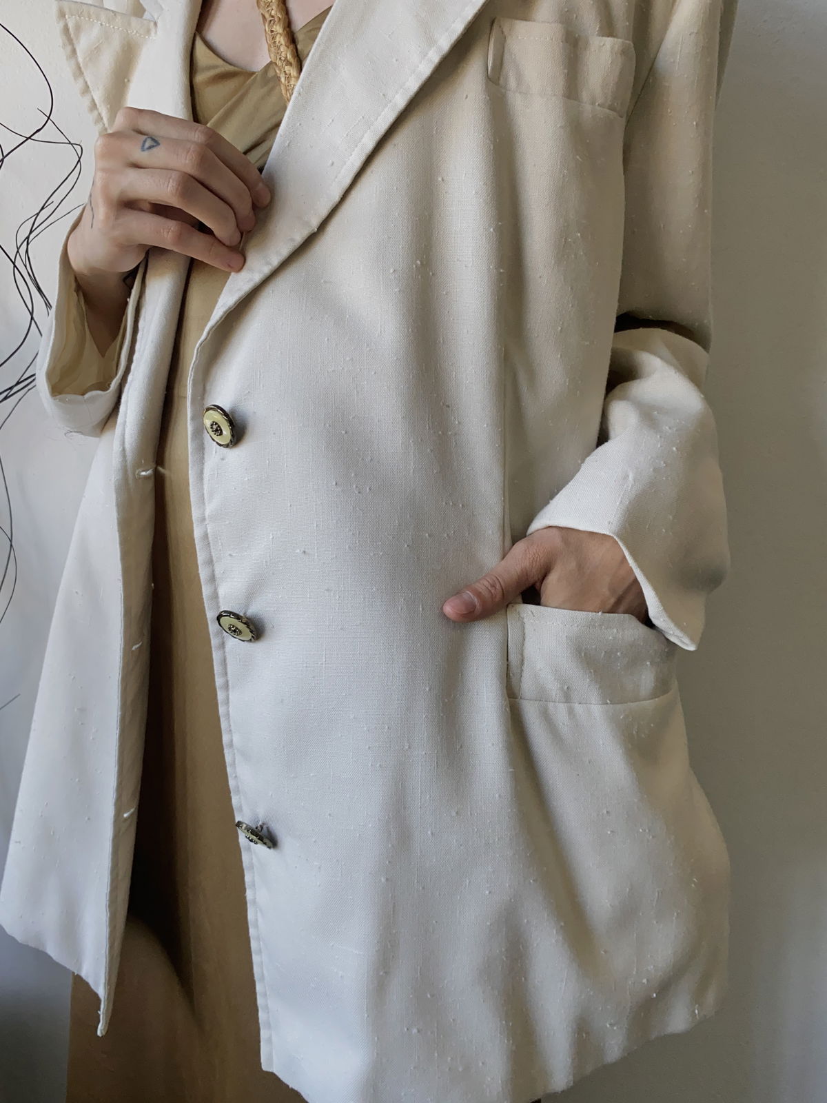 Blazer de tela tipo lino color crema, con bolsillos en ambos lados y botones con detalles dorados (parecen flores). Todo forrado por dentro, talle L