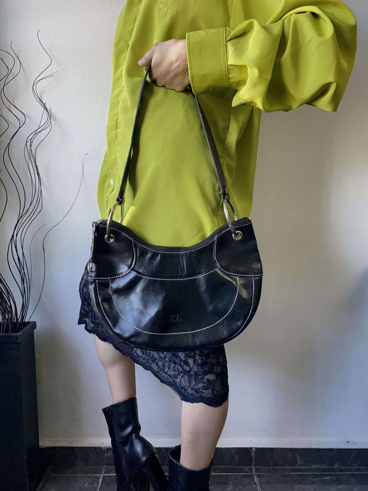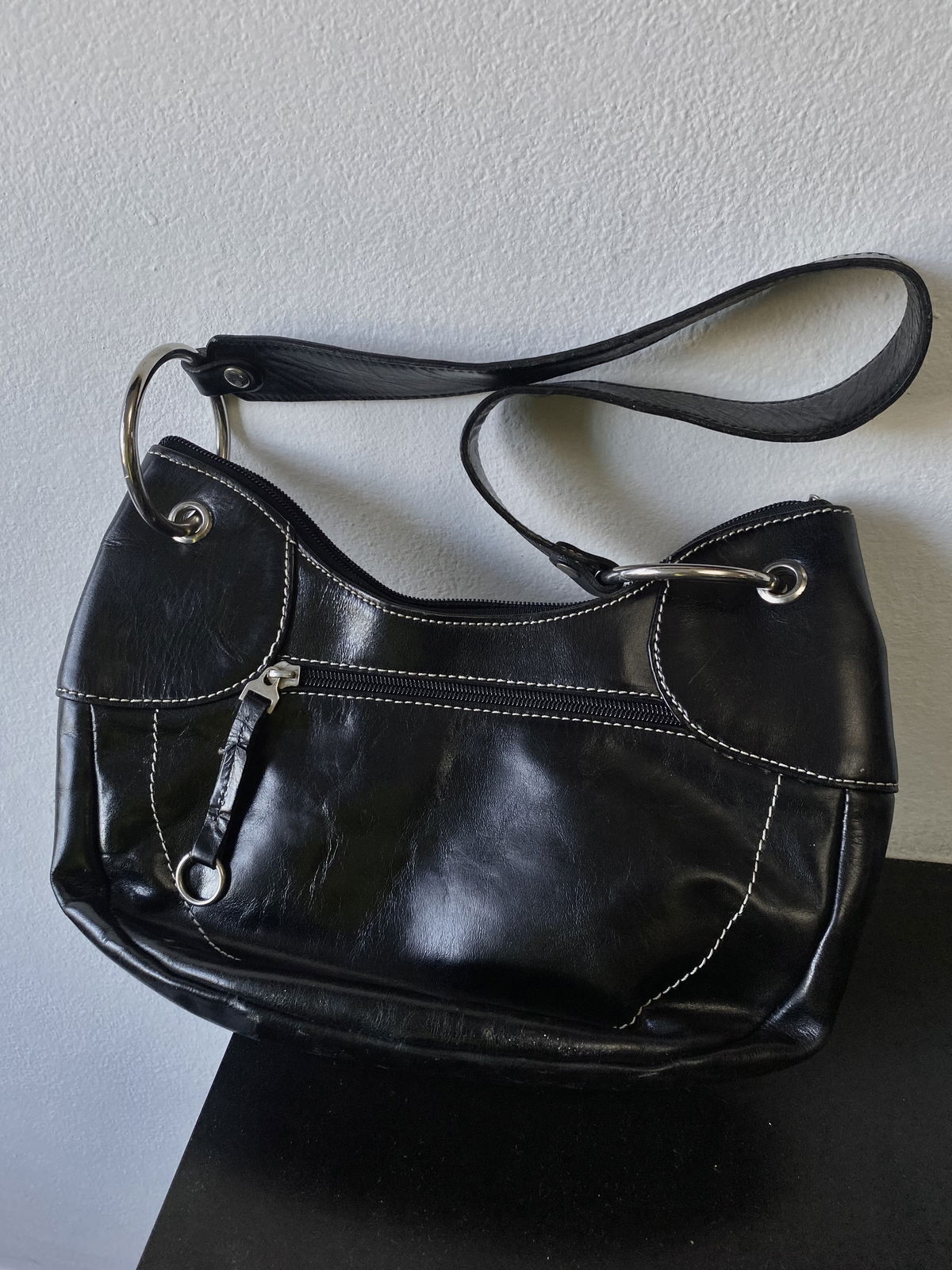 Cartera marca XL color negra, con aros metalicos en la tira y varios bolsillos: uno interior y uno atrás. Impecable