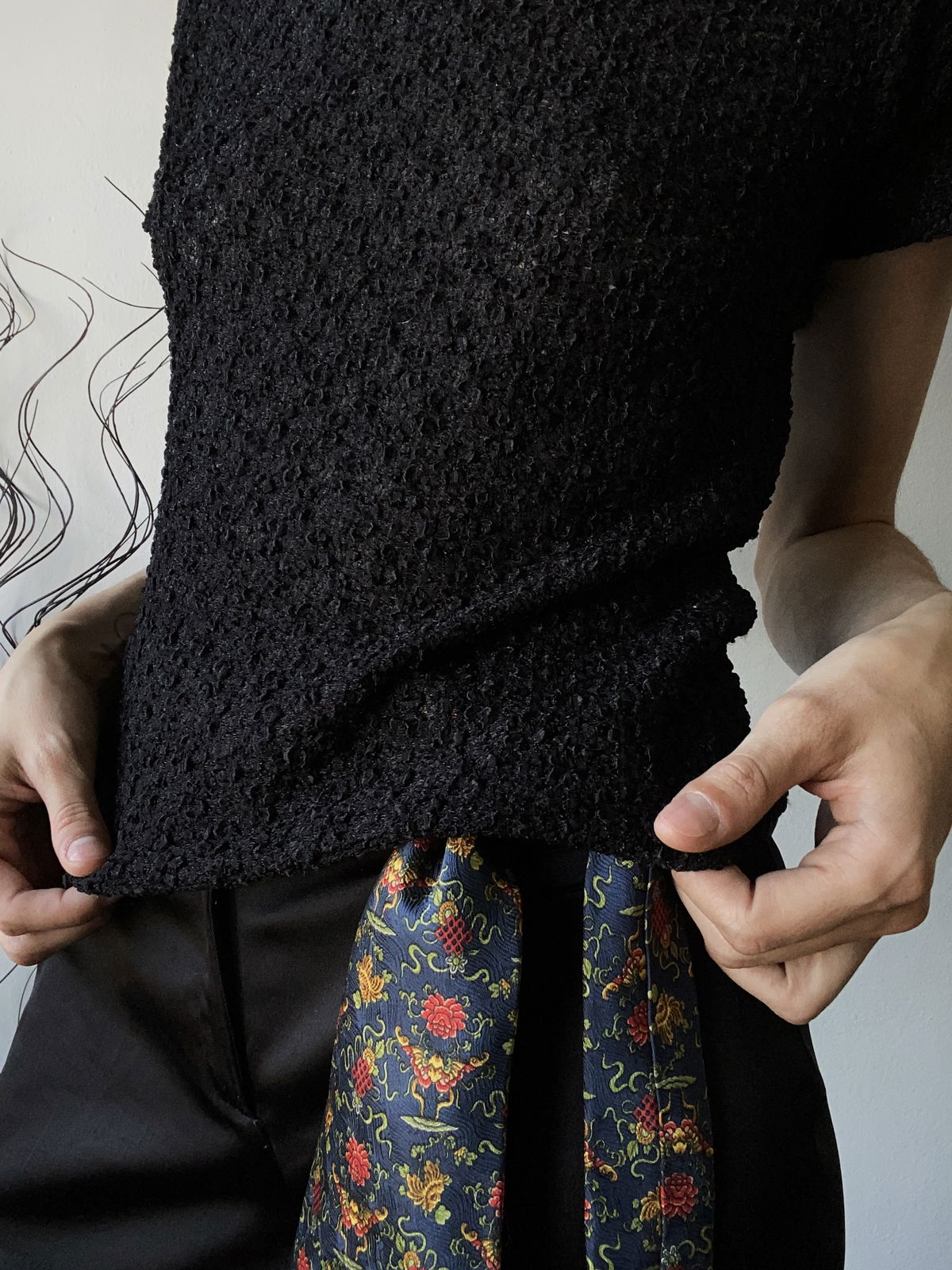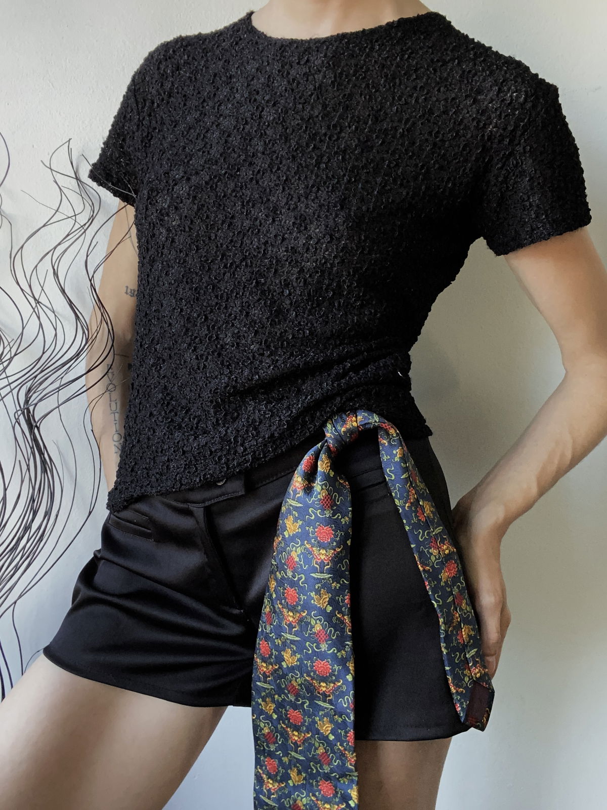 Remera de tela labrada color negro, manga corta al cuerpo, talle S