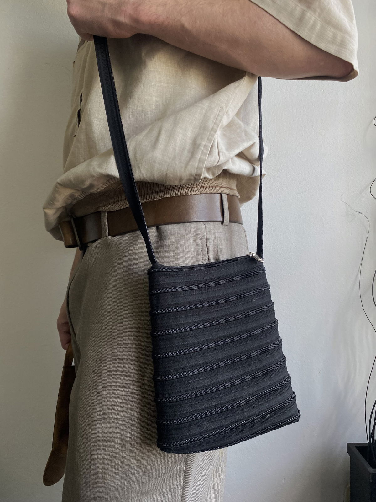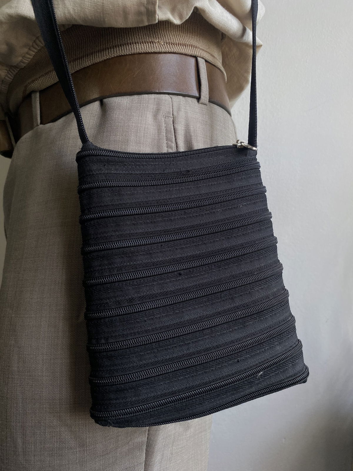 Bandolera mediana color negra, toda hecha de cierres, sin bolsillos interiores. Impecable por dentro.
