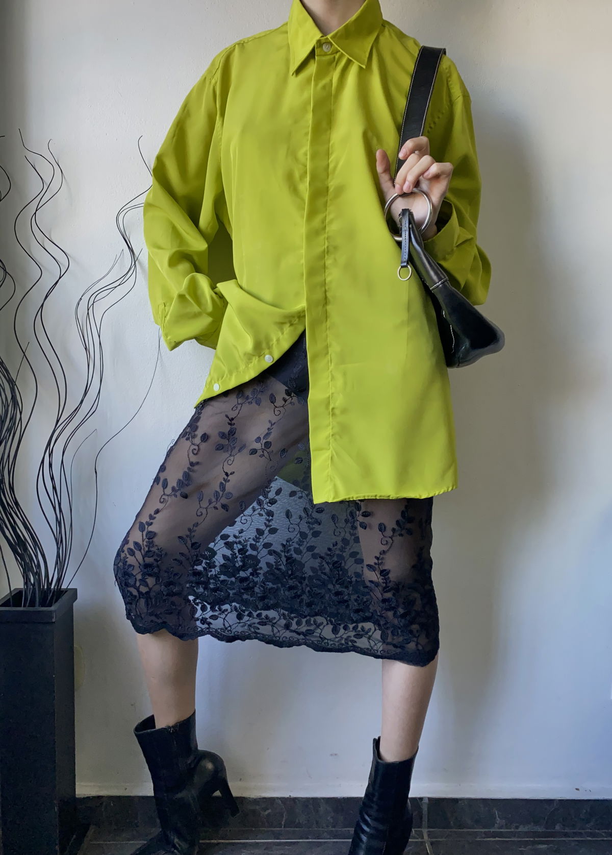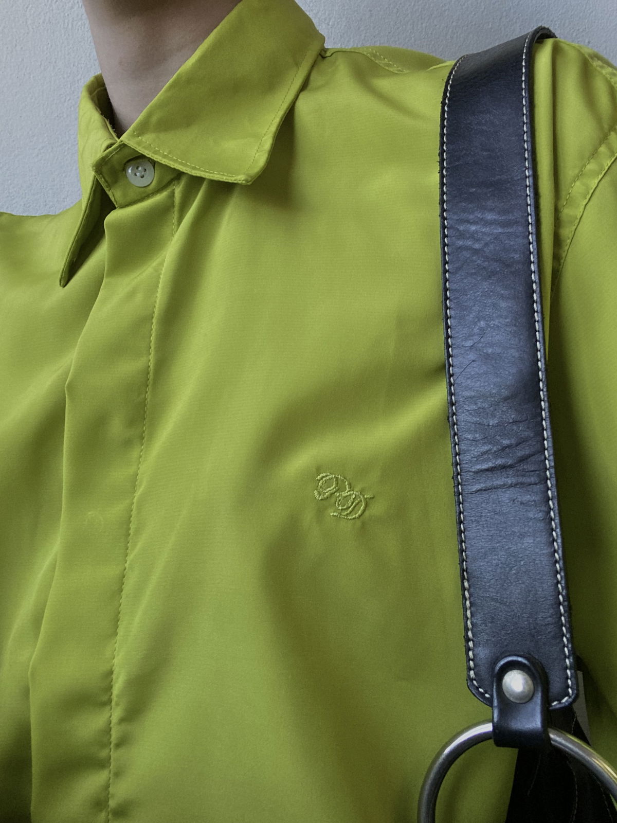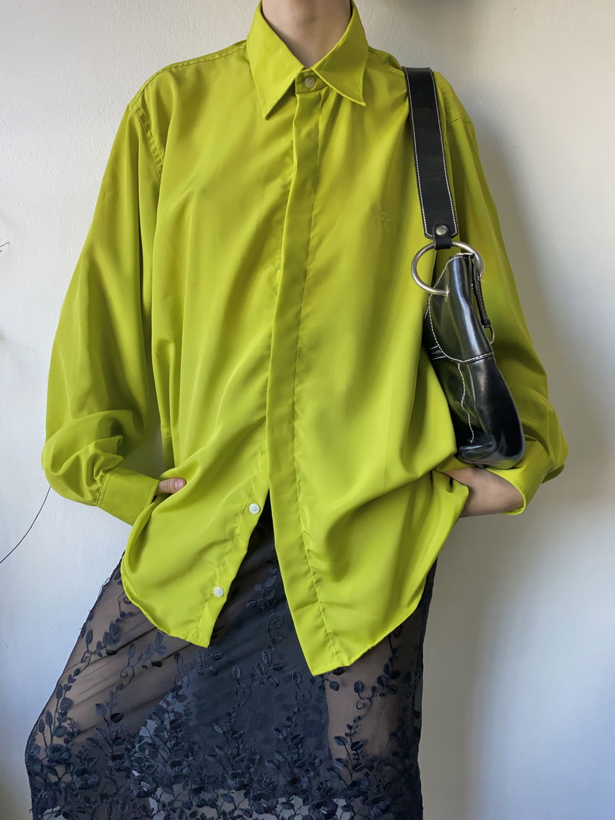 Camisa color lima fuerte, con bordado a un costado, tela súper liviana y fresca tipo seda fria