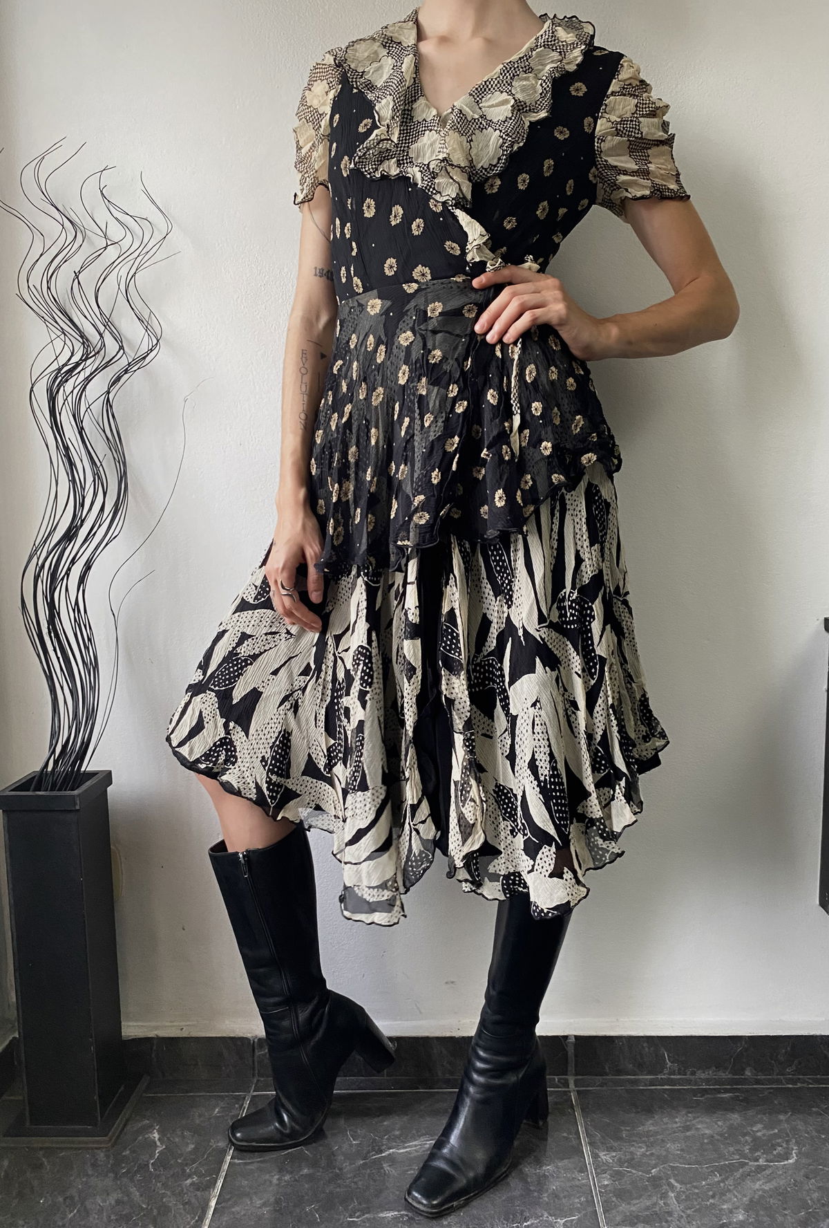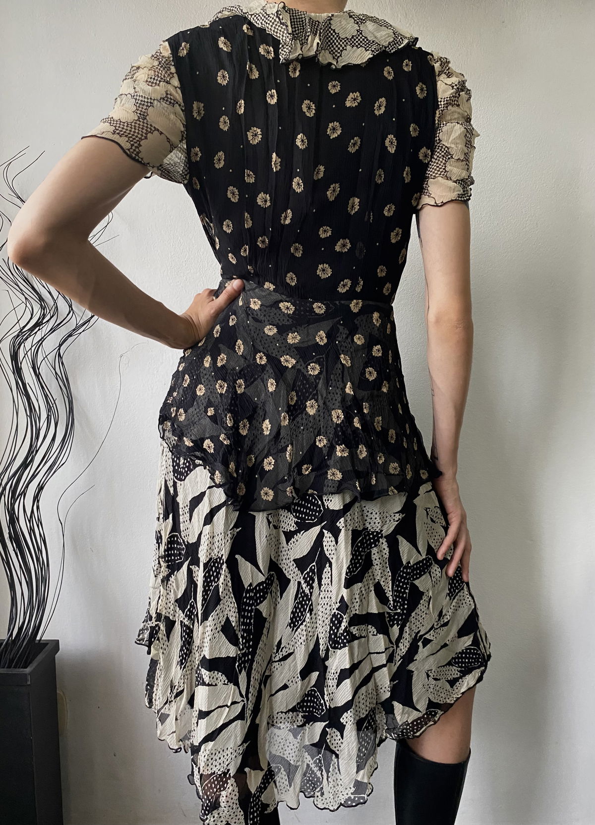 Vestido con volados, doble capa que se ajusta a medida con tiras por dentro y por fuera, manga corta y forrado por dentro. Estampado de florcitas color negro y crema. Talle S