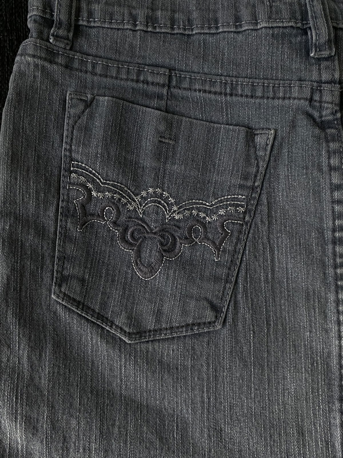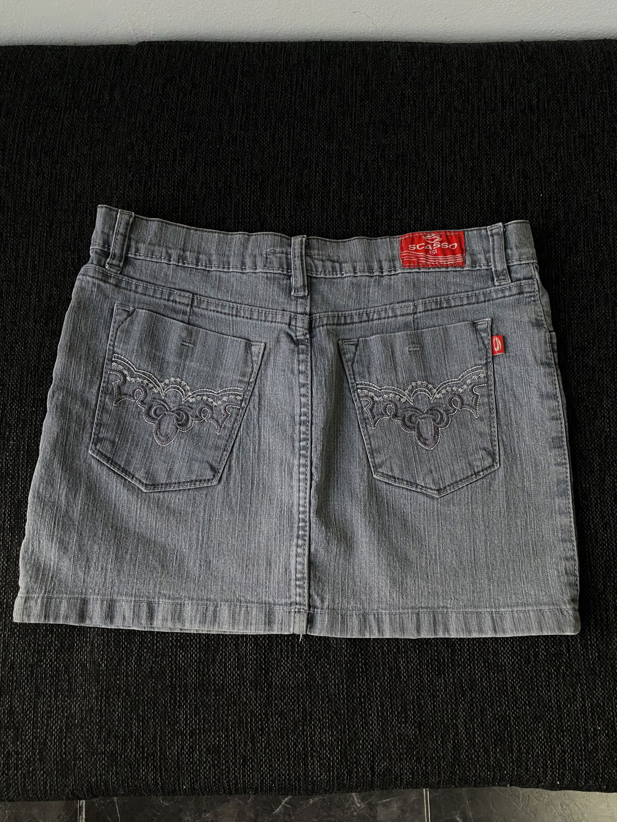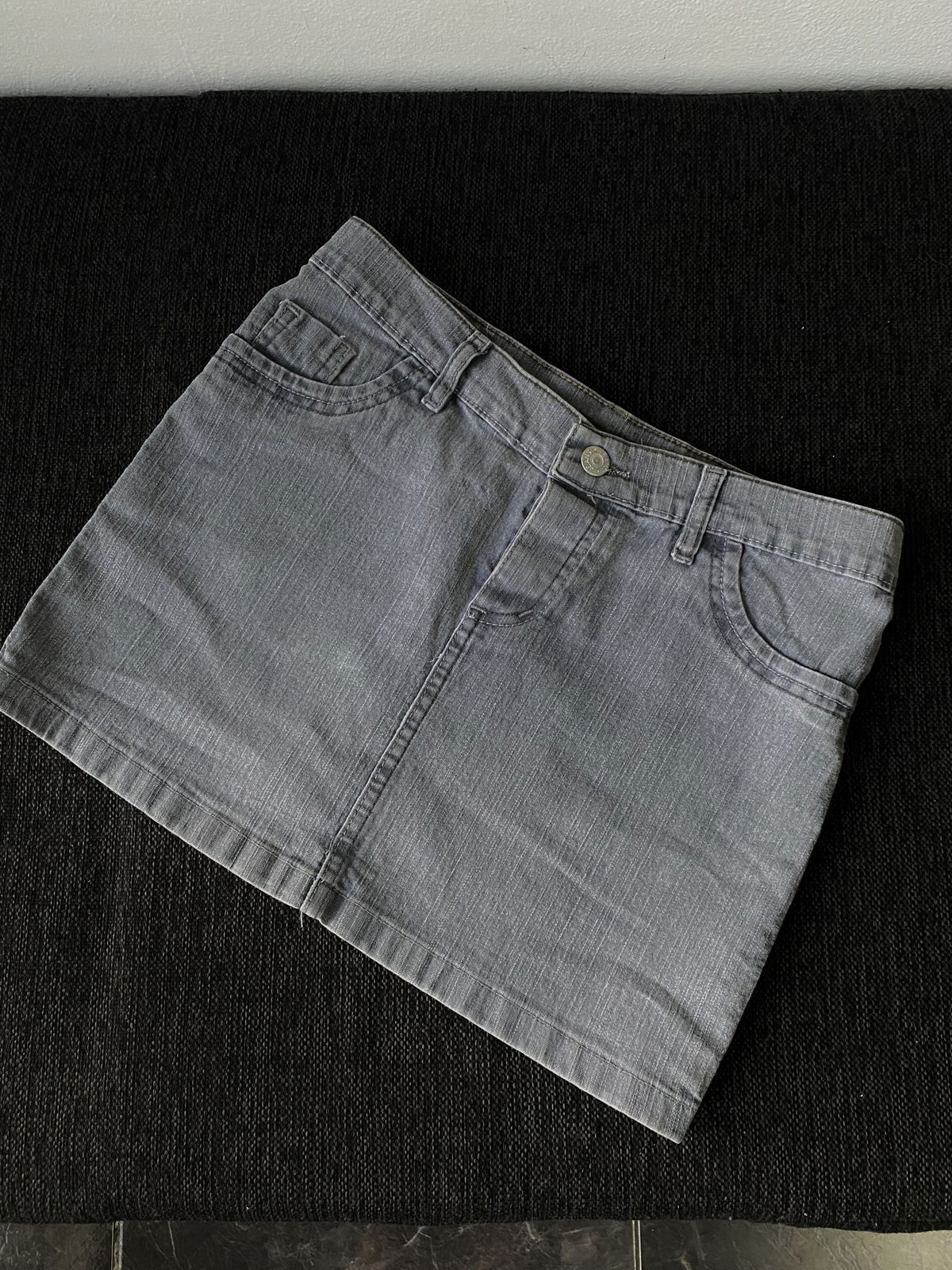 Pollera de jean color gris claro, con doble bolsillo en la parte trasera y bordados. Pasacinto, talle 36 elastizada