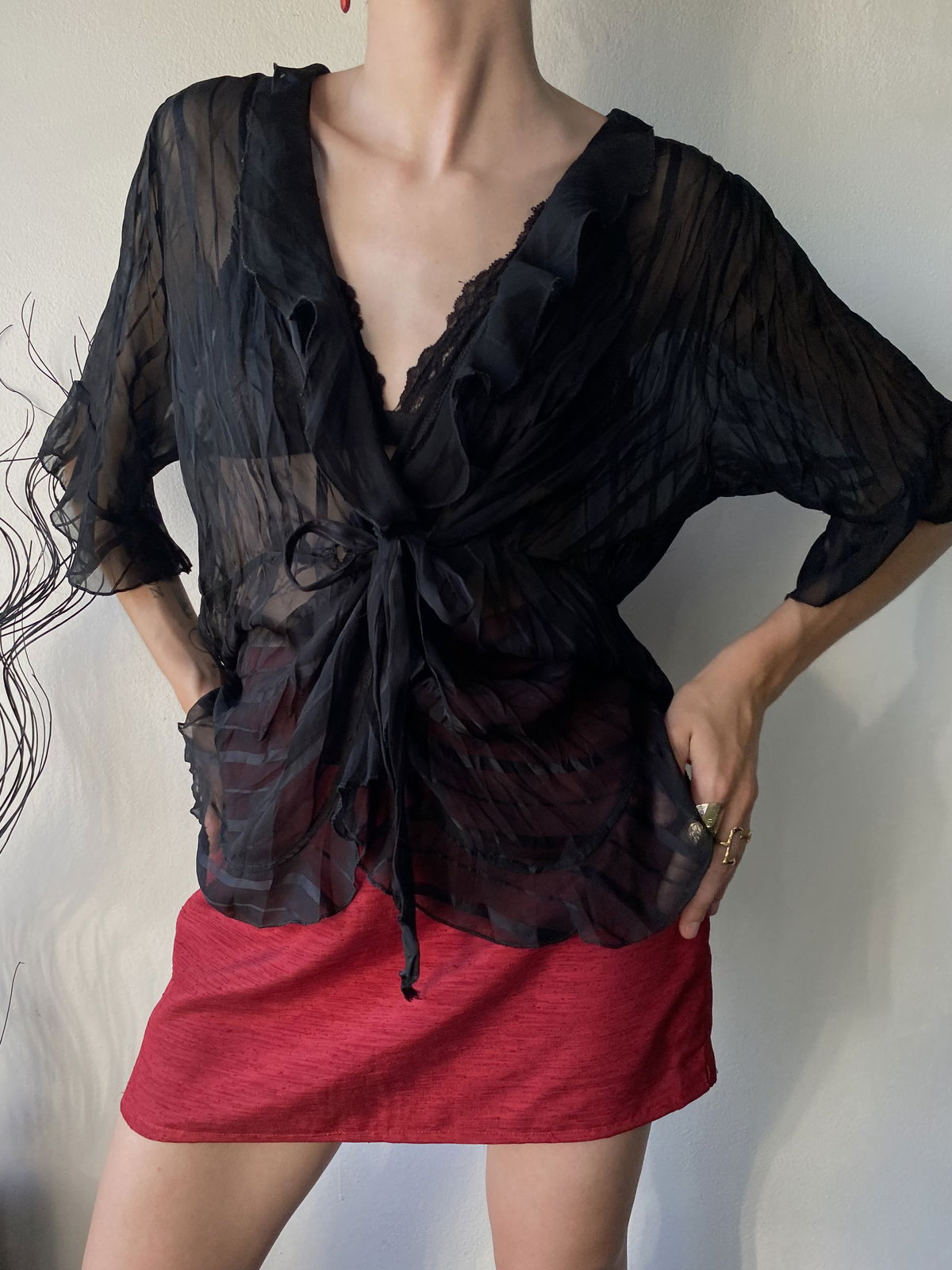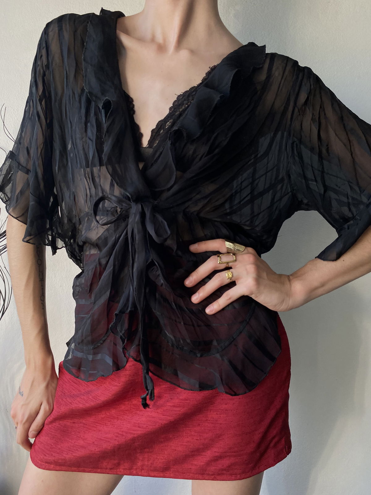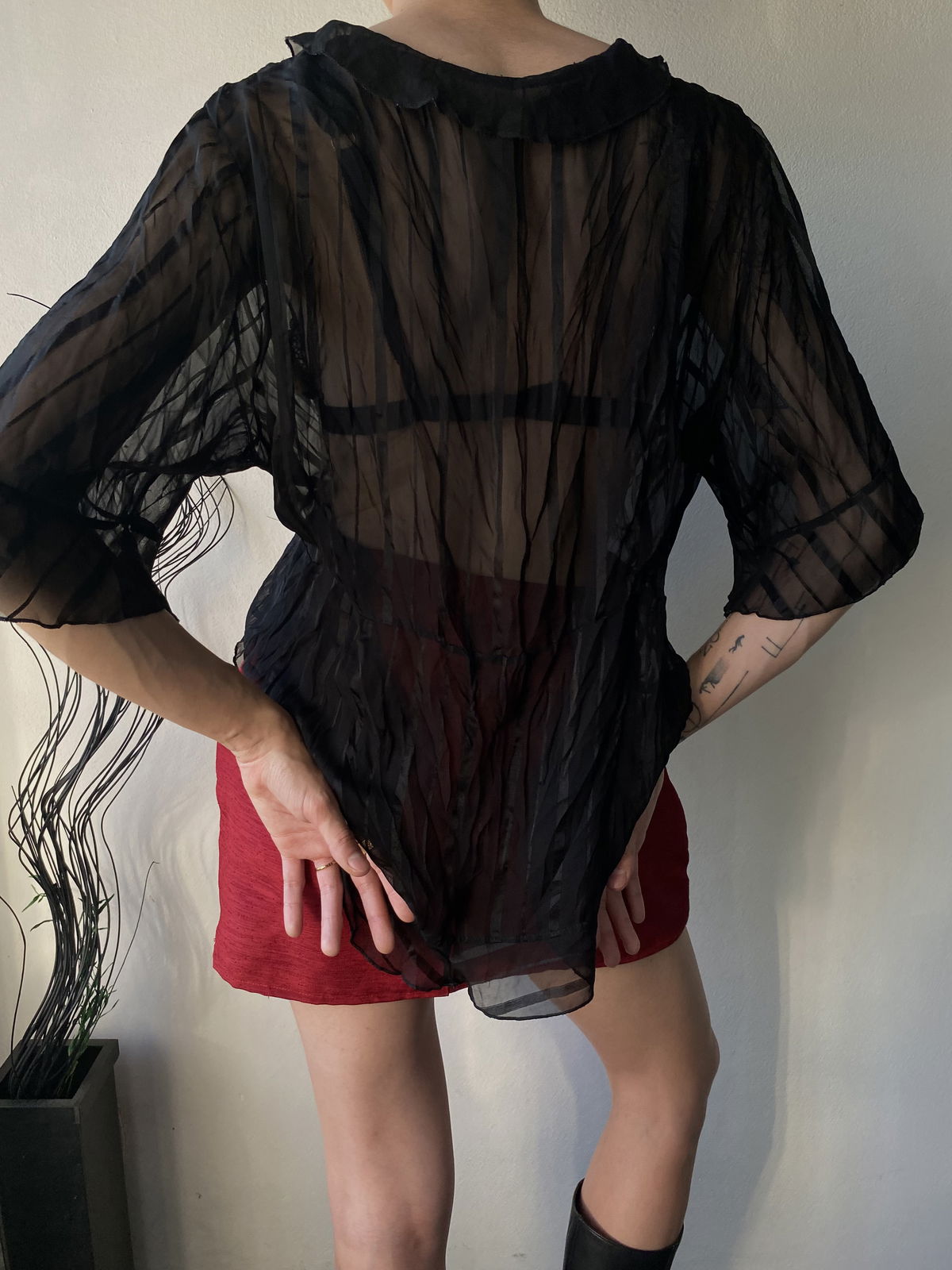 Blusa estilo corrugado y media transparente, con bolados en el frente y en las mangas, súper liviana.