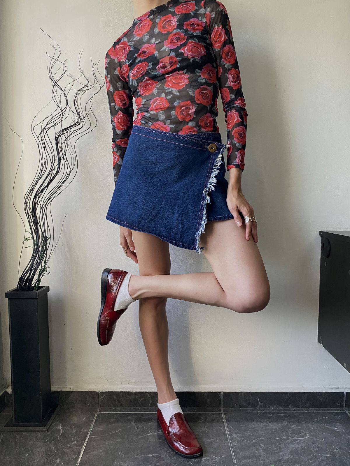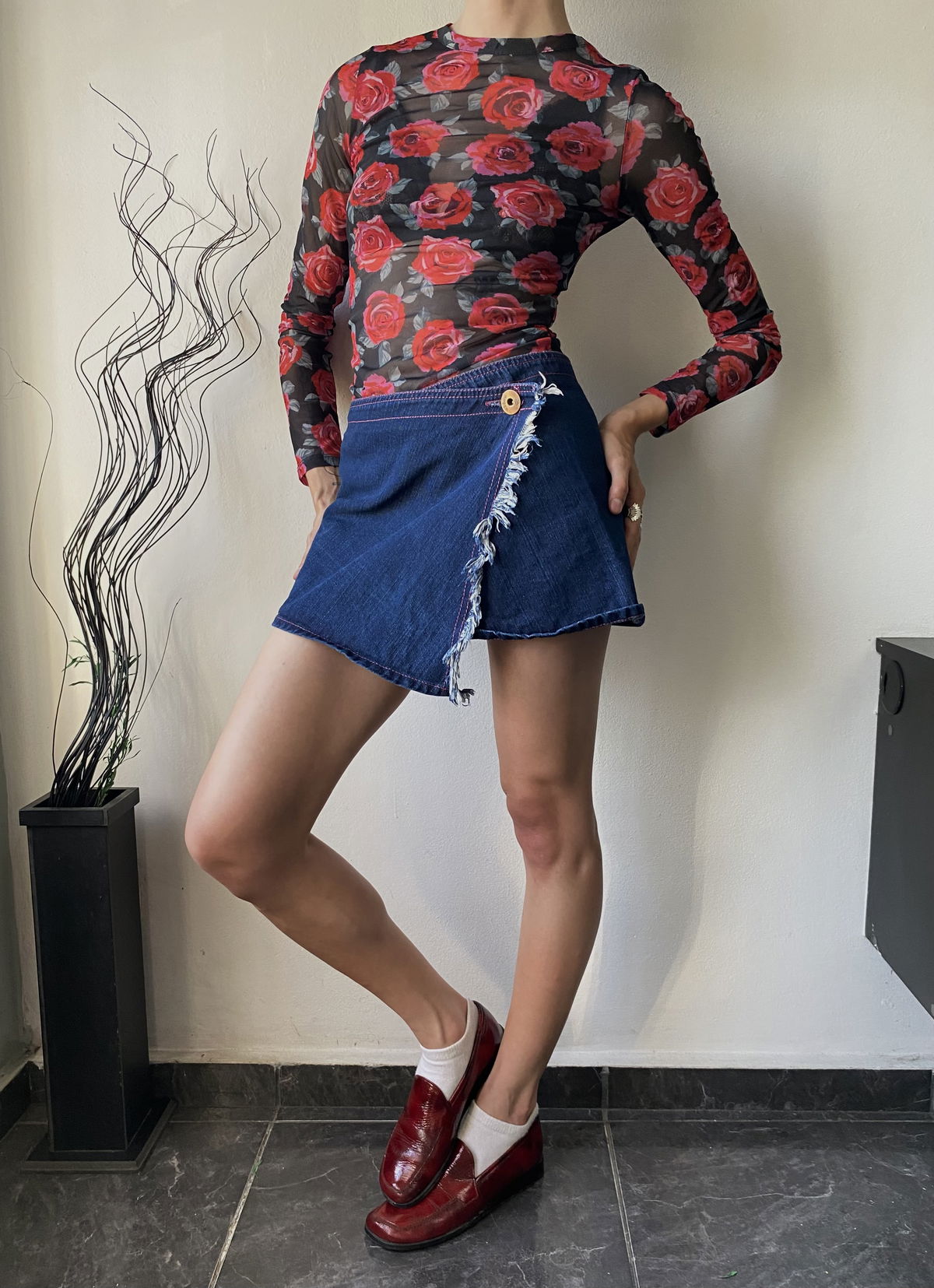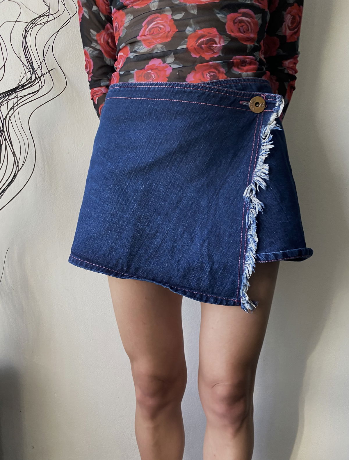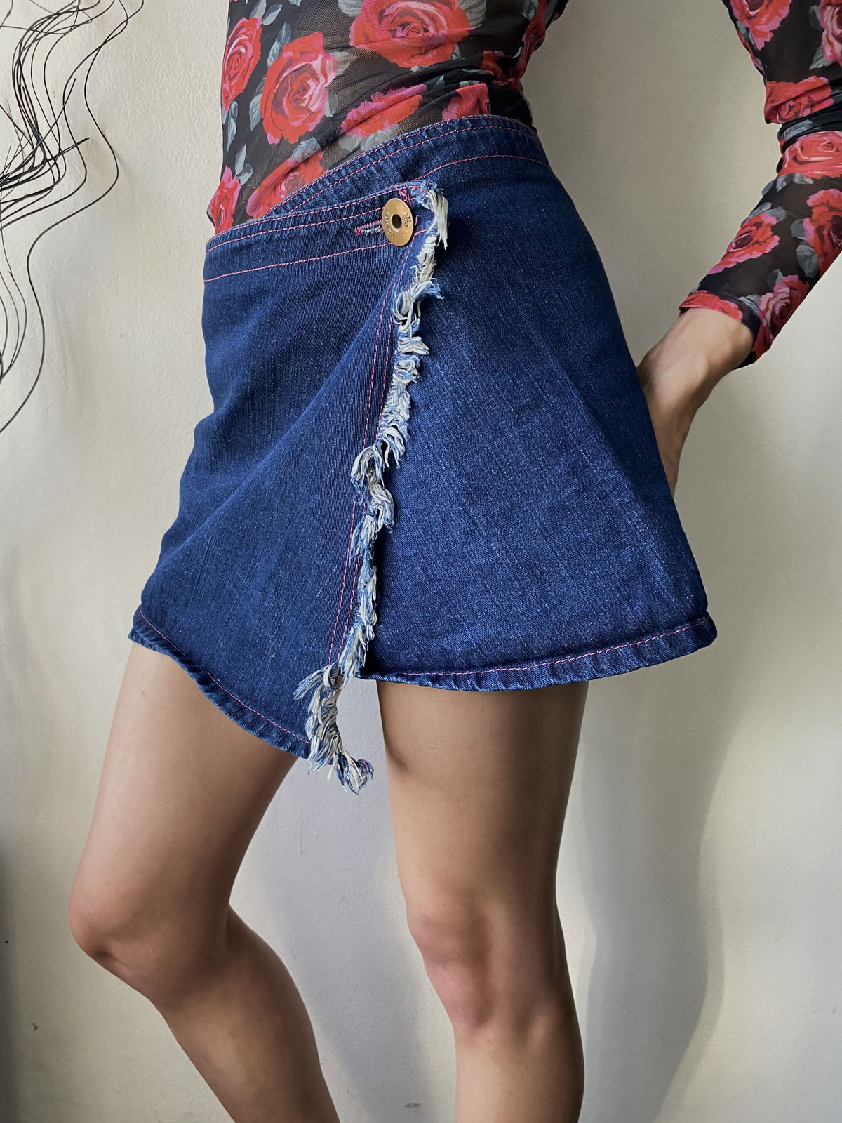 Pollera de jean azul oscuro, con costuras en fucsia, asimétrica con doble solapa. Talle 36 chiquito