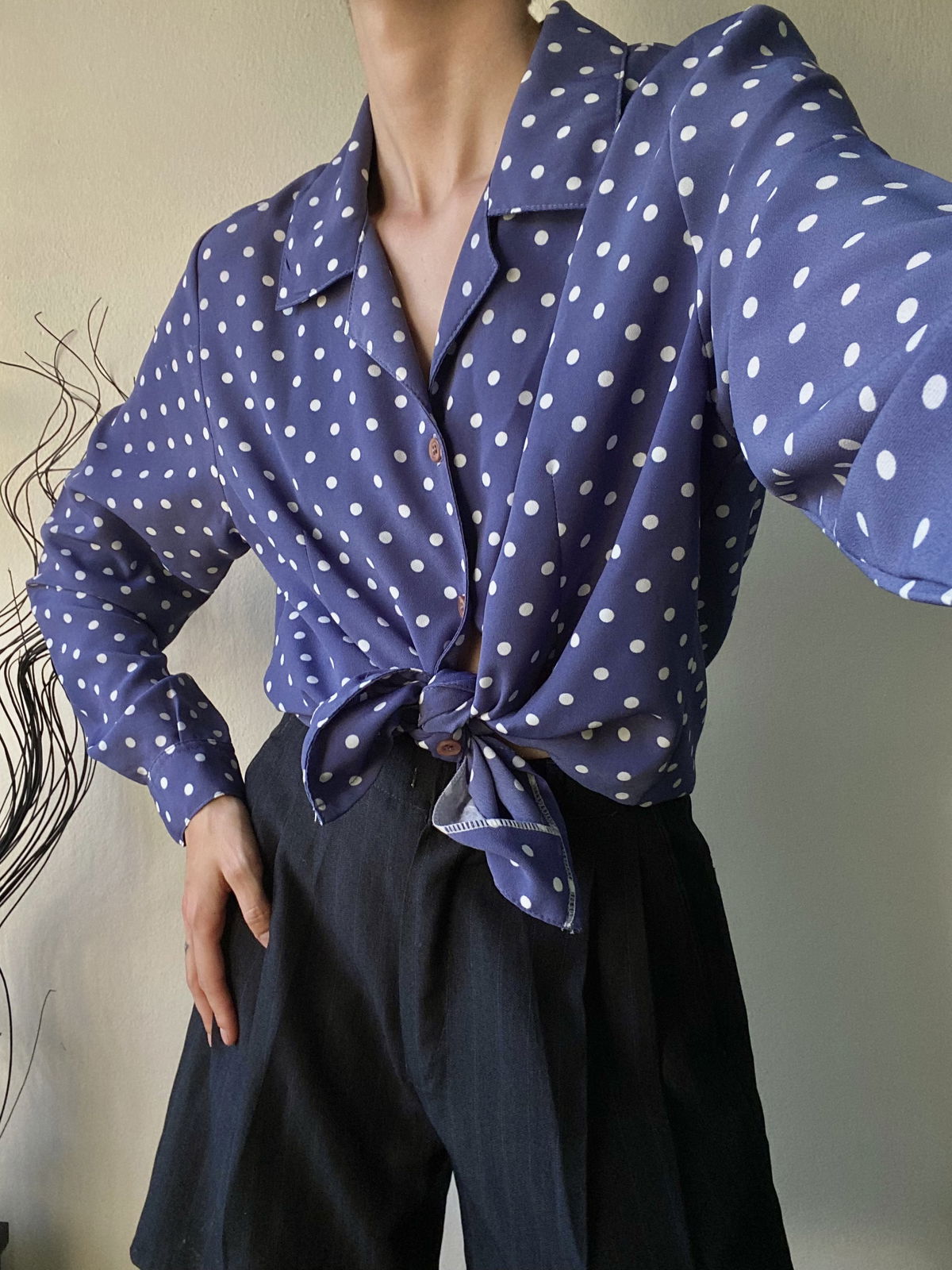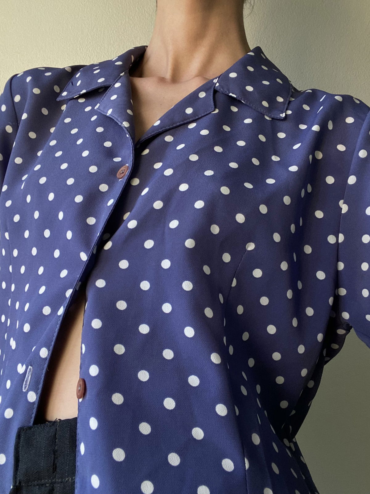 Camisa color azul con lunares en blanco y botones medios rojizos, tela liviana y fresca.