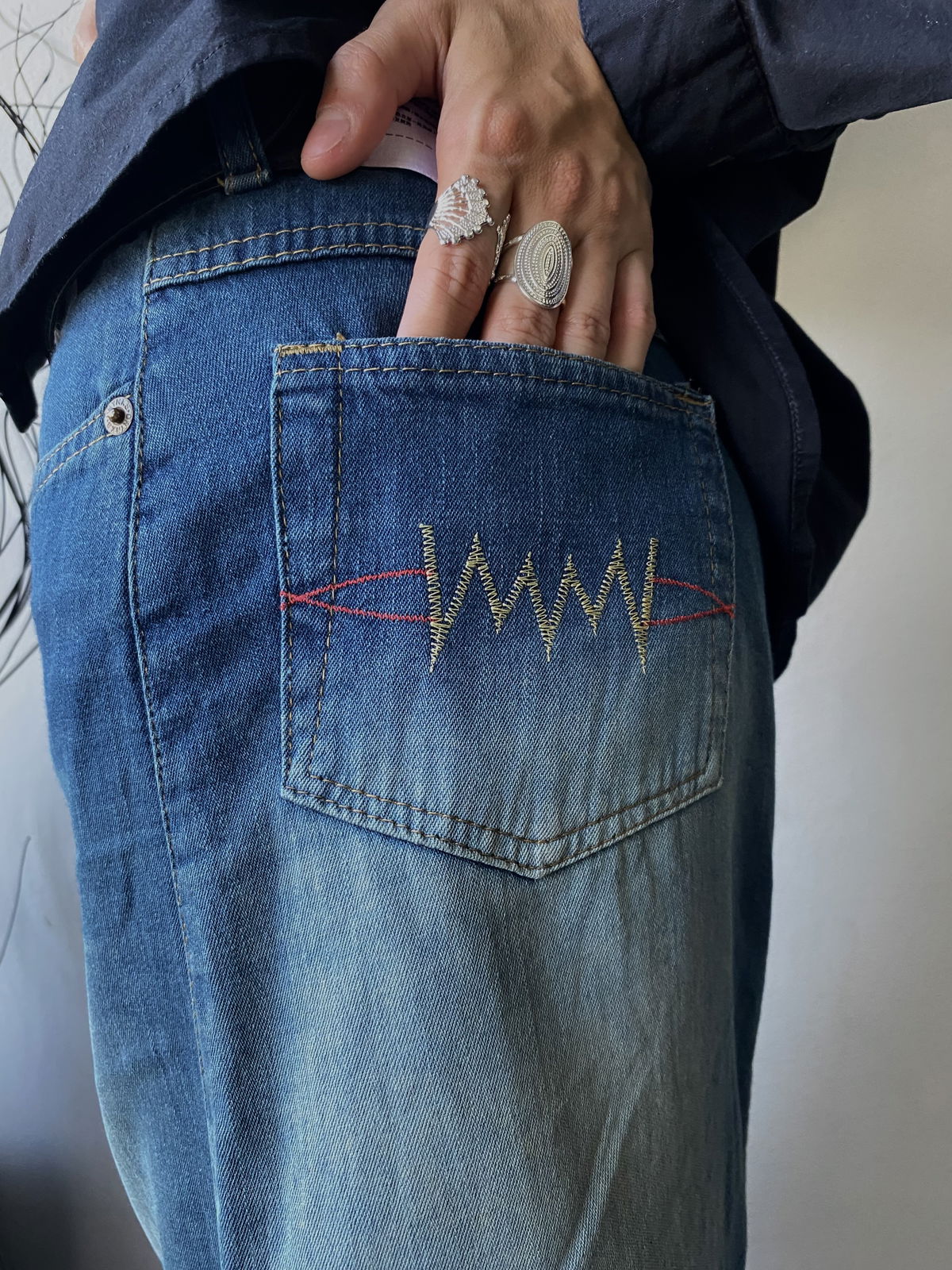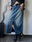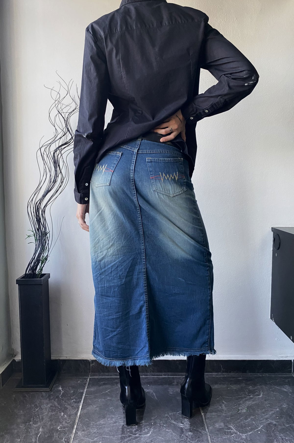 Pollera larga de denim liviano, azul con tintes verdosos tipo oxid, desflecada en terminaciones con bolsillos reales delanteros y traseros. Bordado en la parte de atras, pasacinto y tajo en frente. Talle 36/38