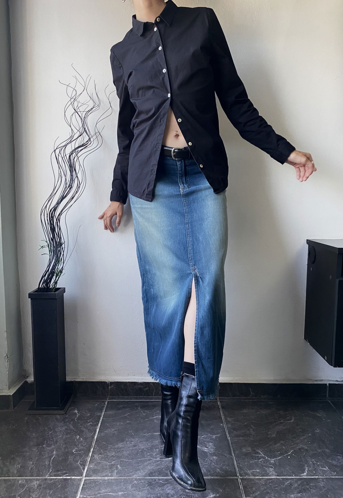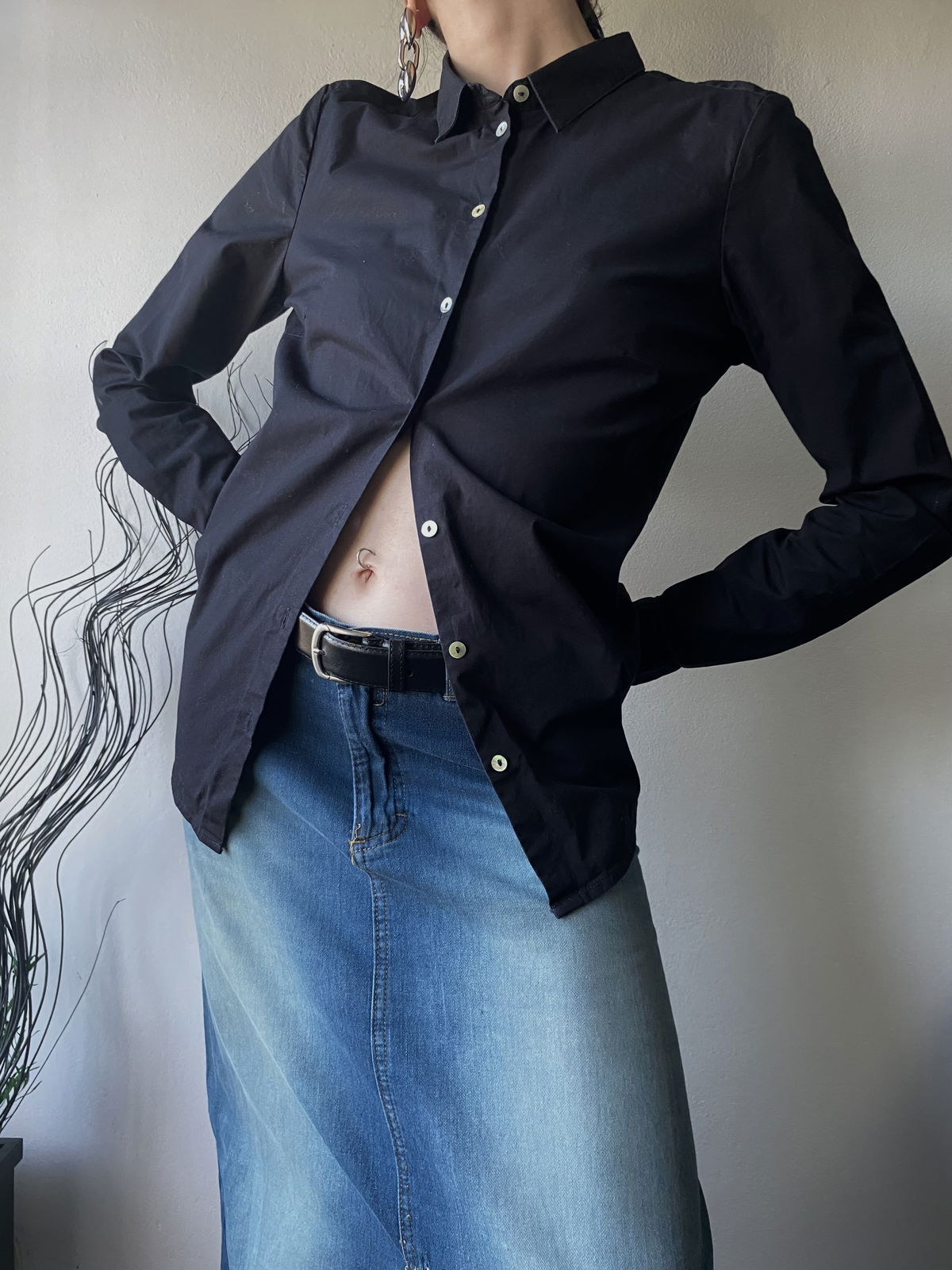 Camisa estilo slim fit, color negro con botones tornasolados de tela rigida, no se transparenta.