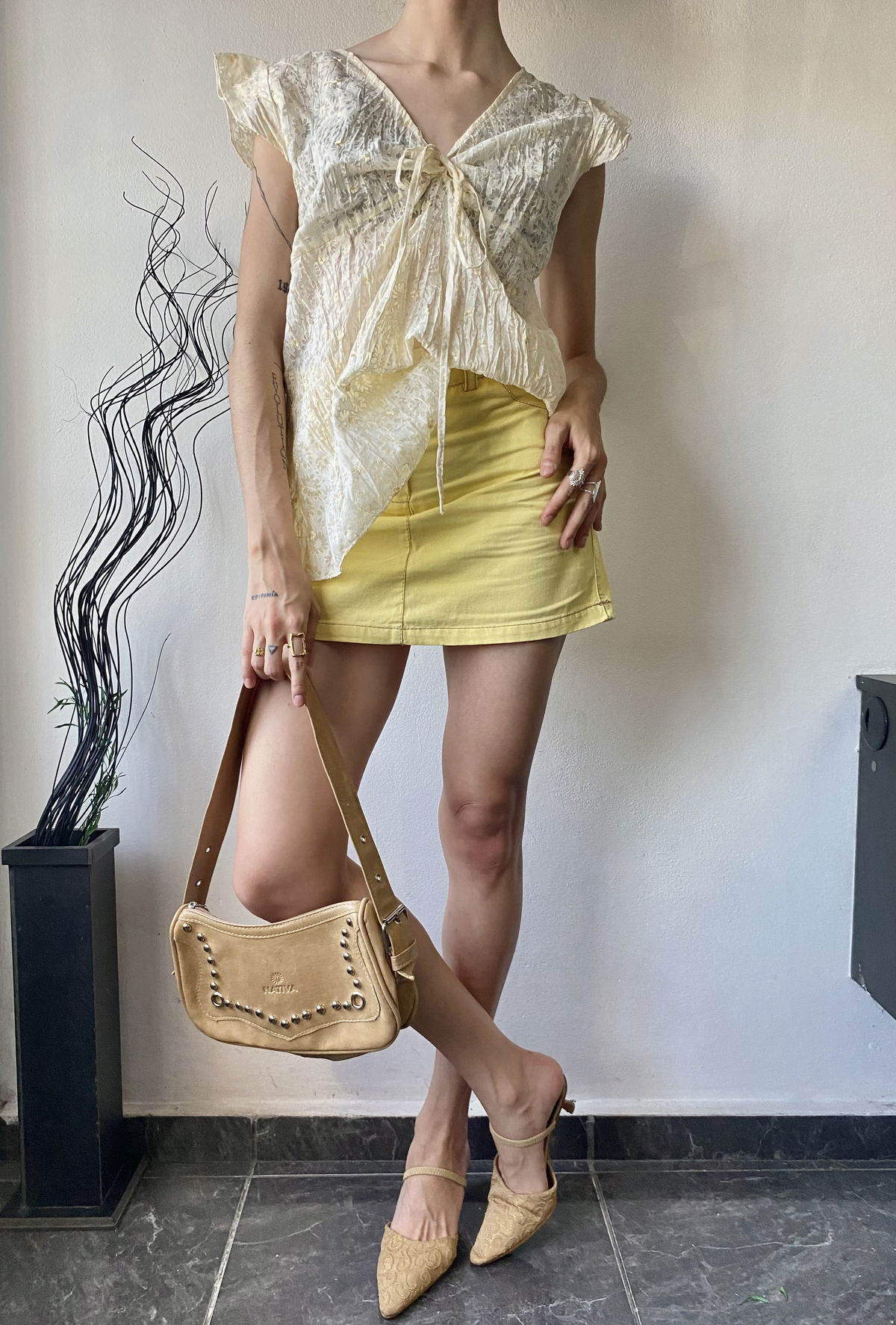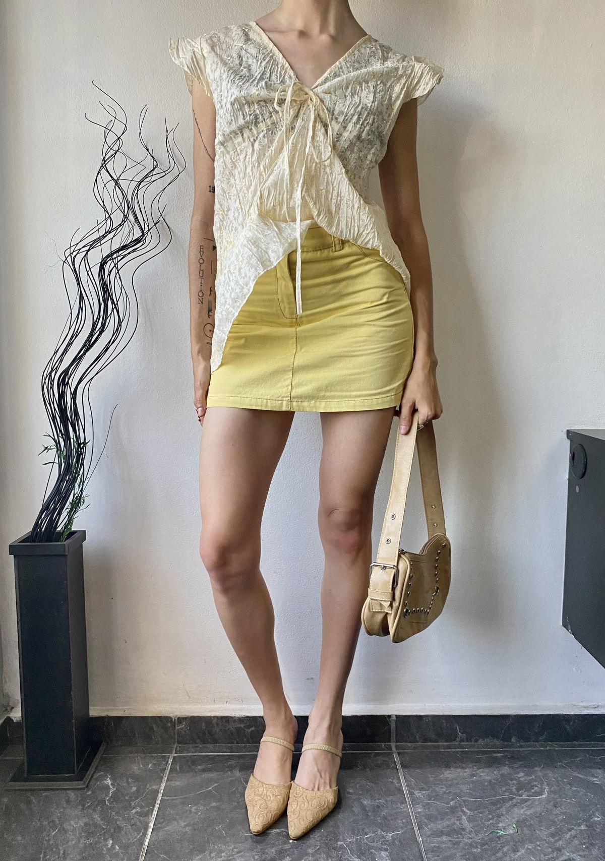 Mini de denim liviano color amarilla, con bolsillos reales solo en la parte trasera y pasacinto. Talle 36