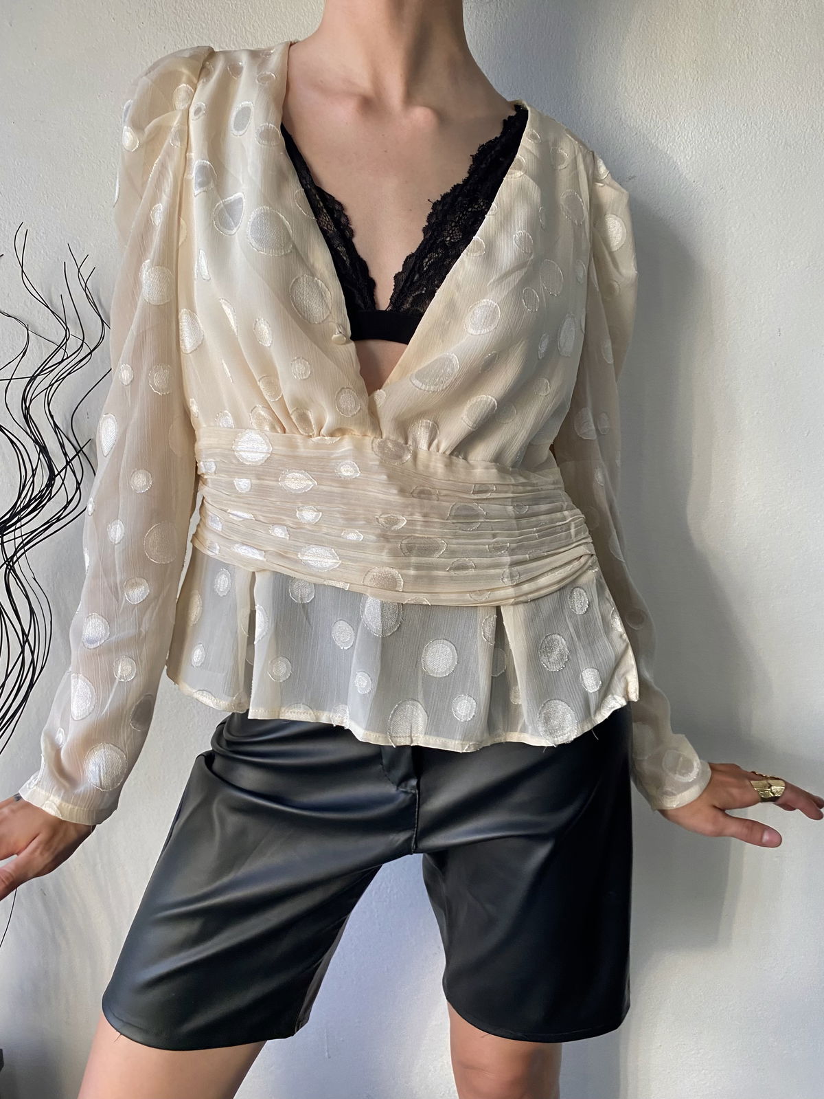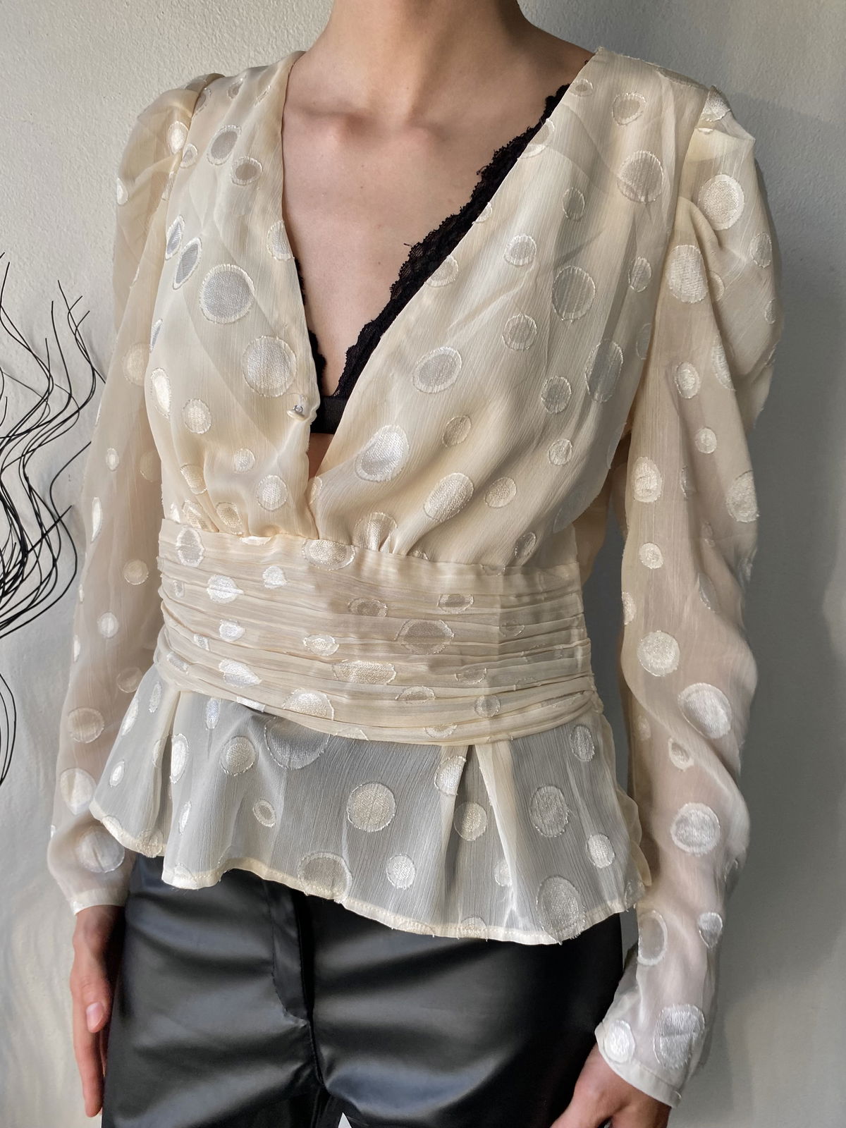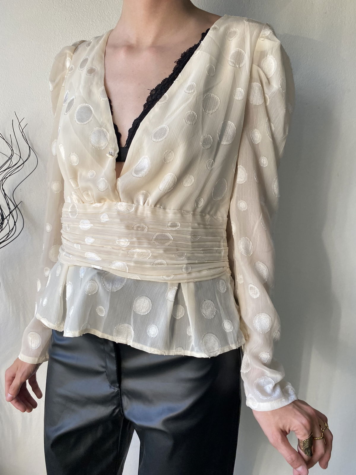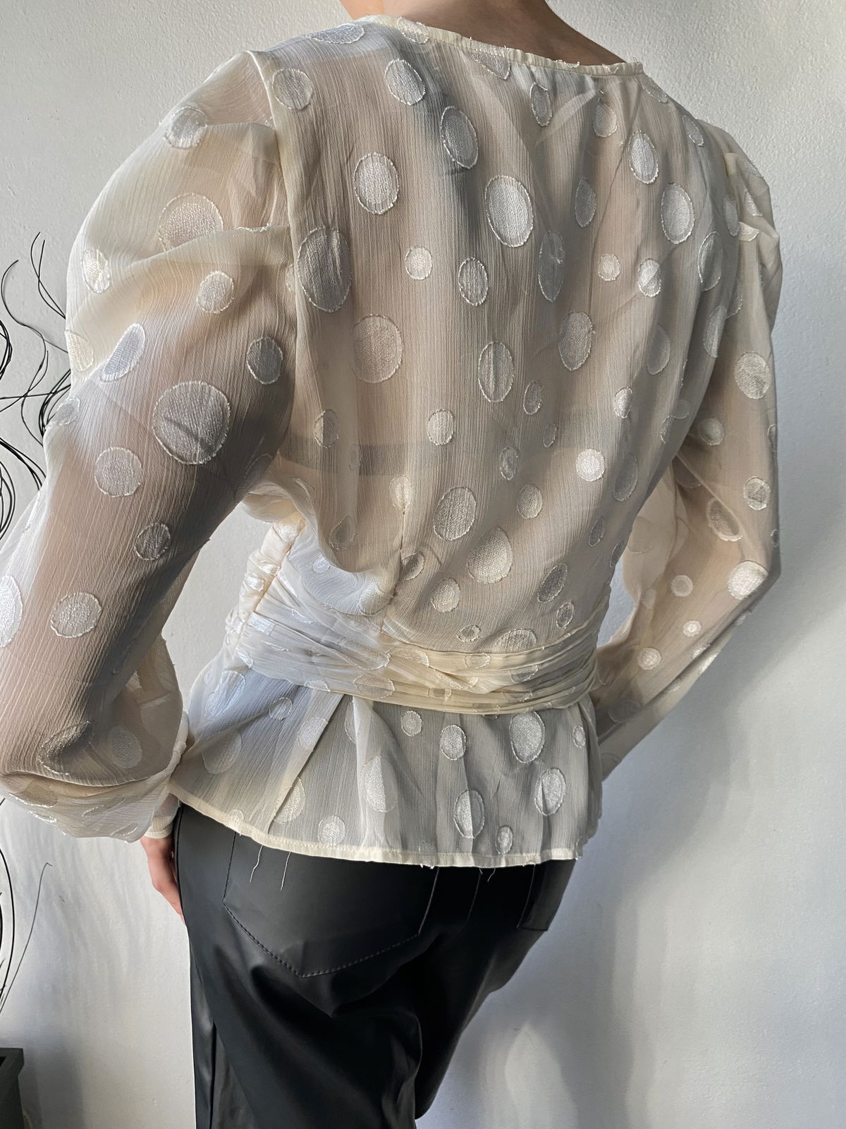 Blusa estilo "princesa", color rosa clarito con lunares bordados mas brillosos, volados y manga y espalda mas transparente. Un solo botón en la parte delantera y cierre invisible al costado.