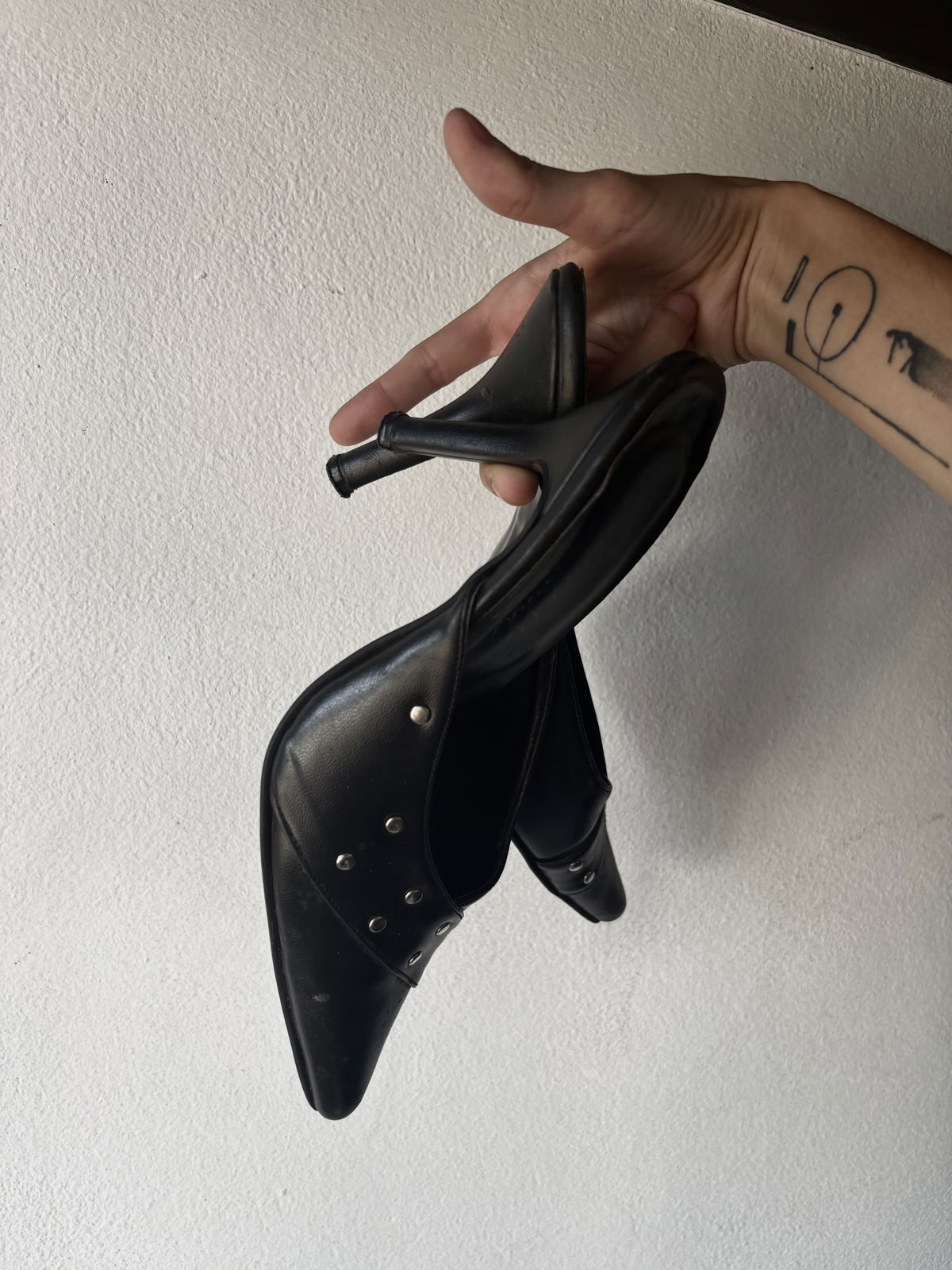 Stilletos color negro, de cuero con pequeñas tachas plateadas en la parte delantera. Con suela, taco y plantilla impecables. Talle 37