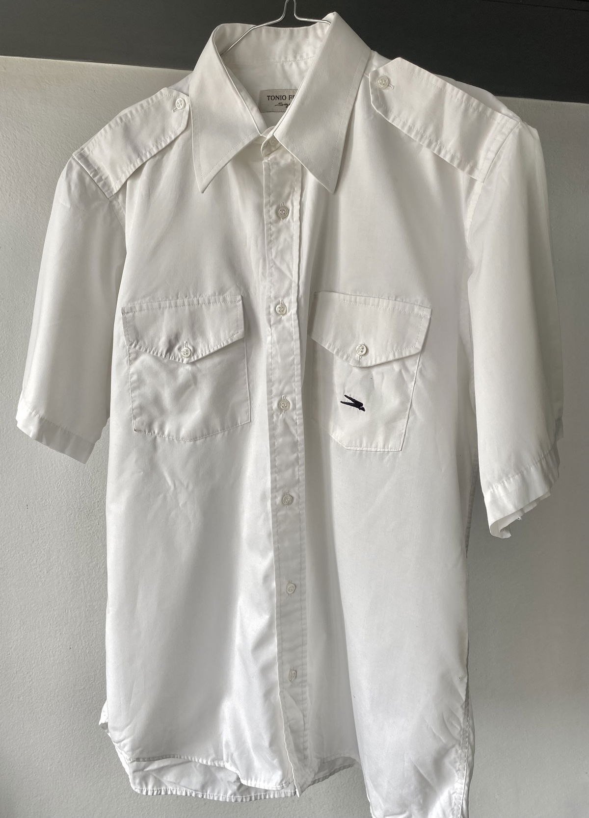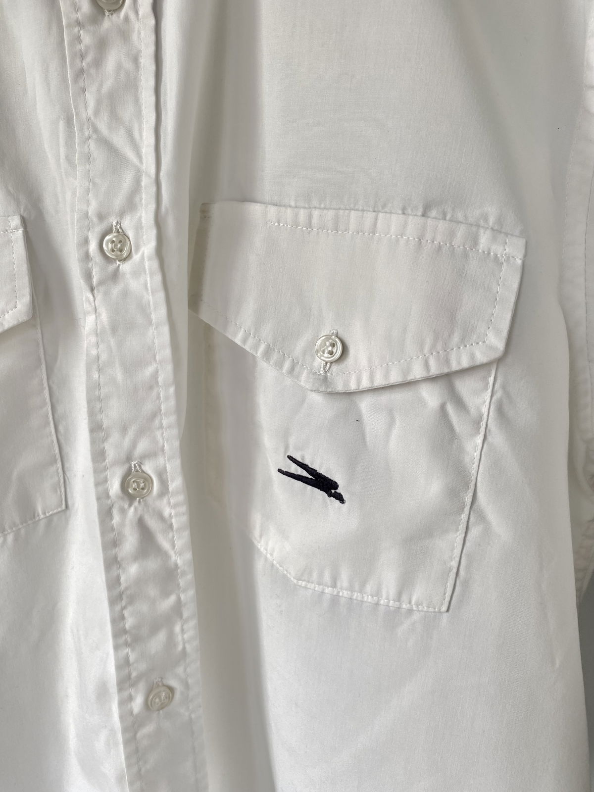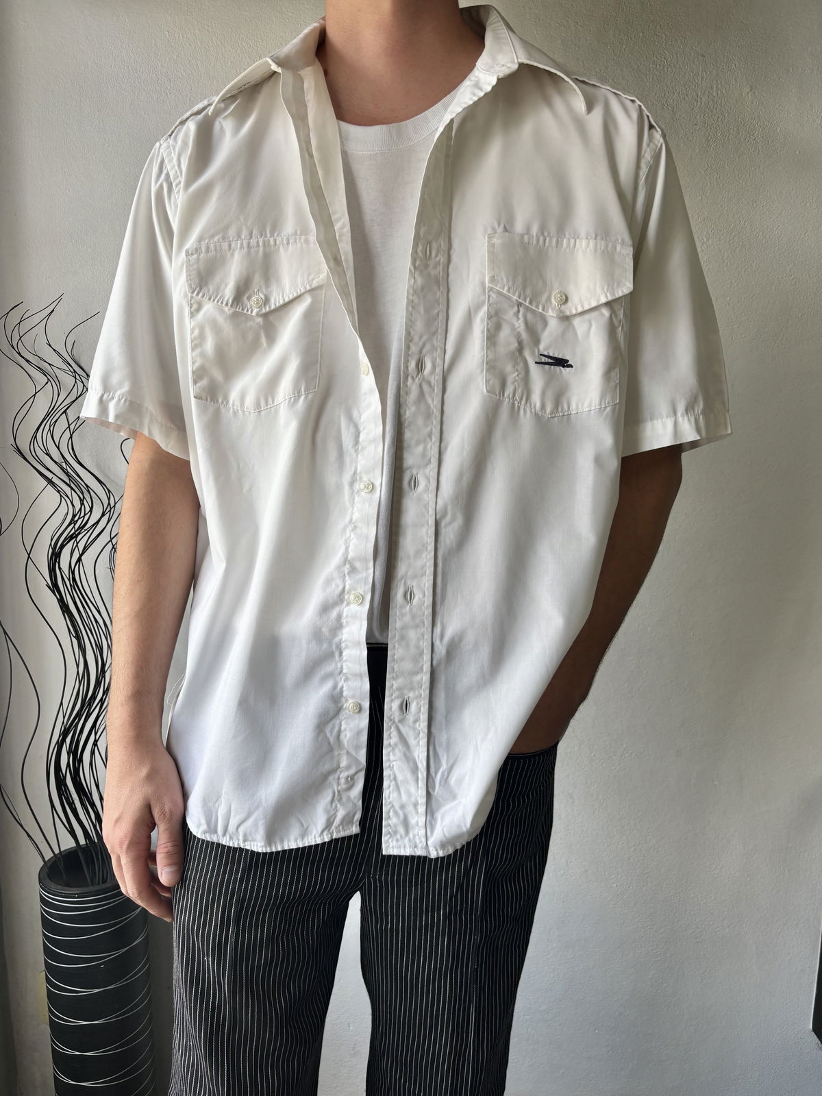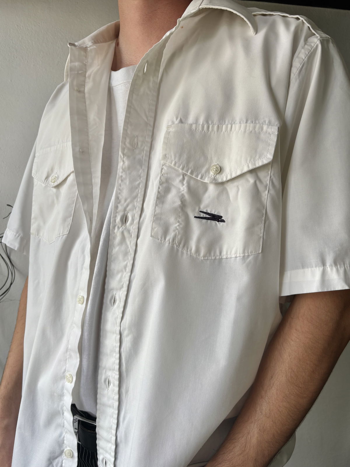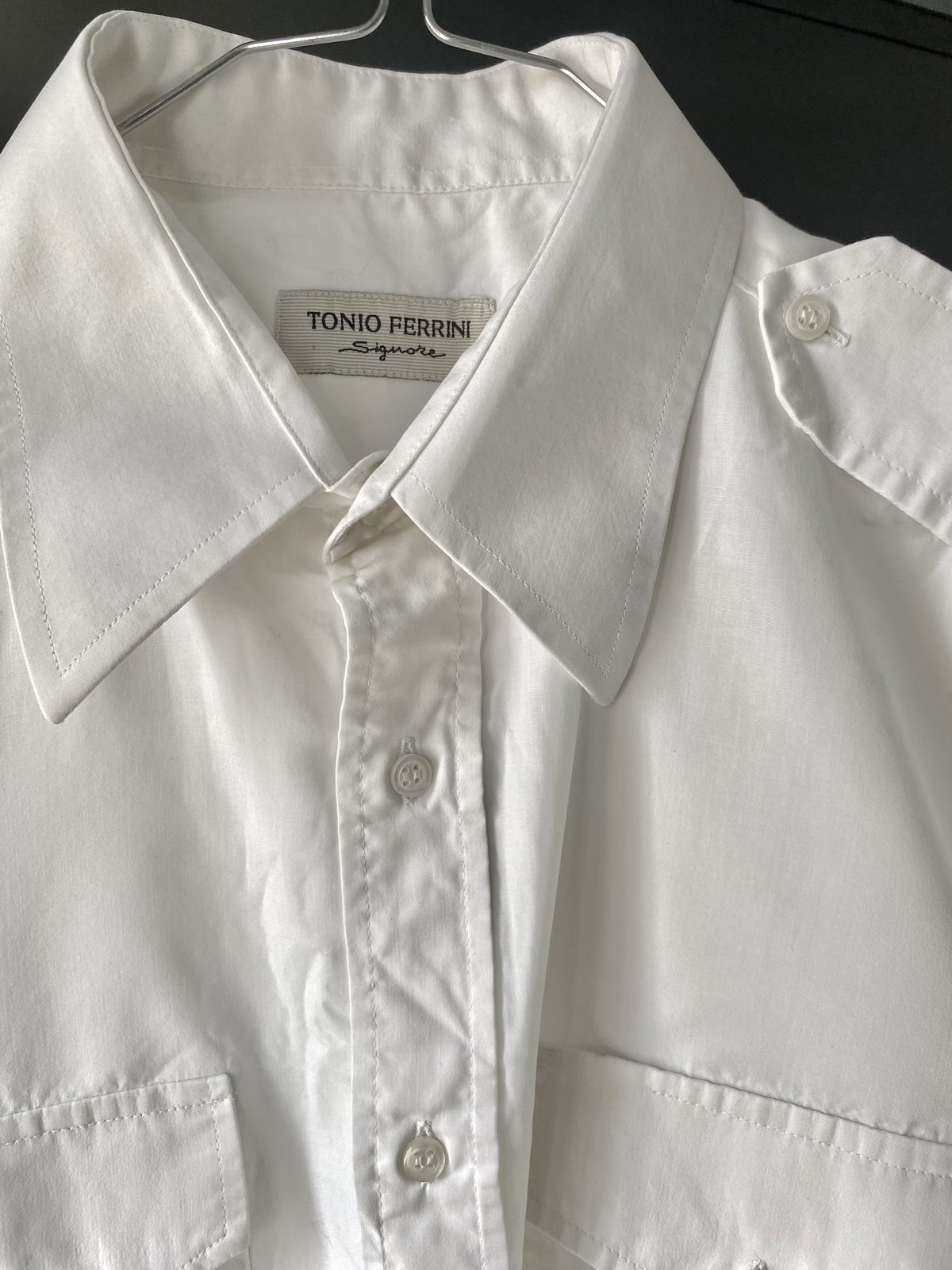 Camisa marca Tonio Ferrini, color blanca con detalle bordado de la marca a un costado y arandelas con botones de accesorio en los hombros. Doble bolsillo con botón en la parte delantera, talle M/L.
