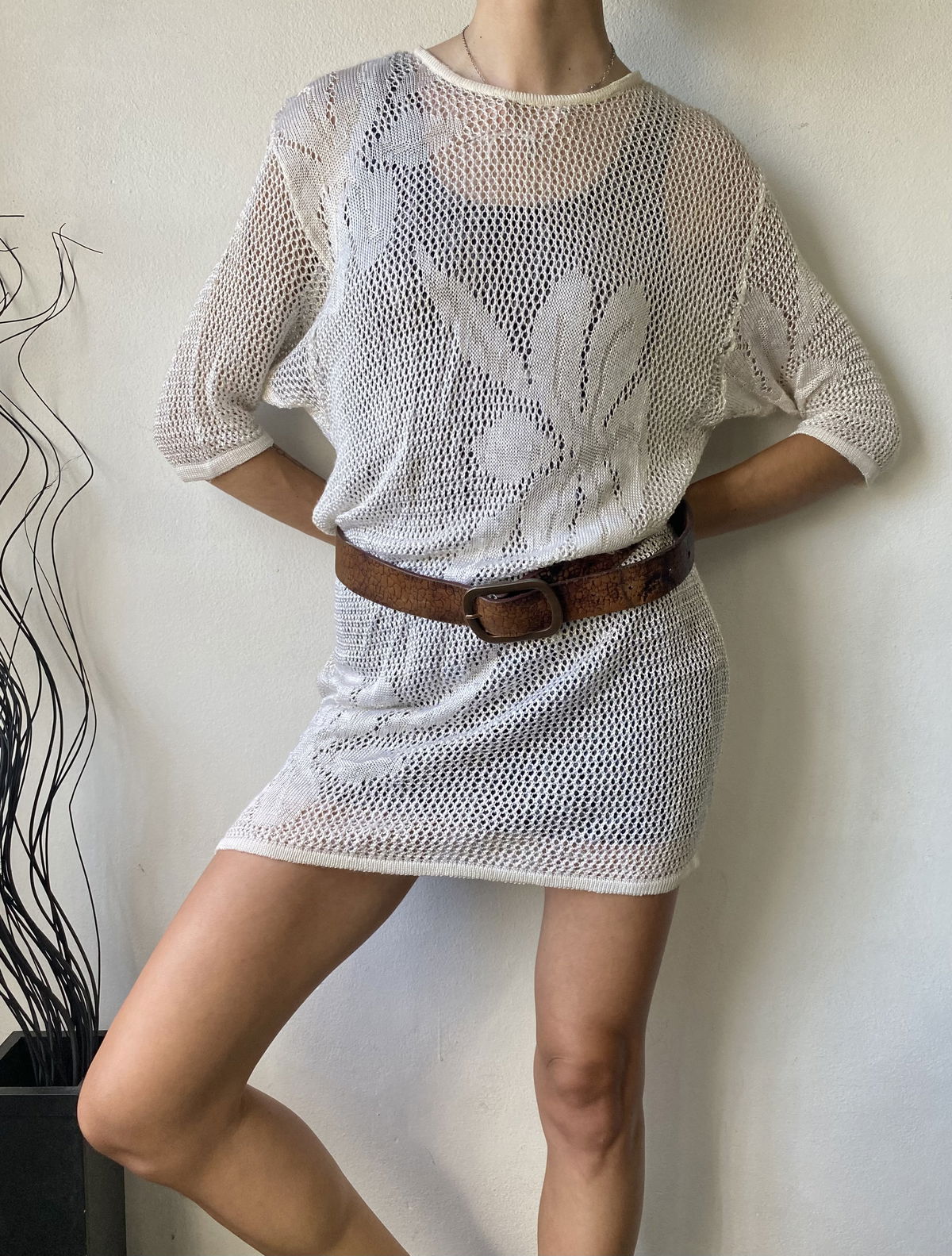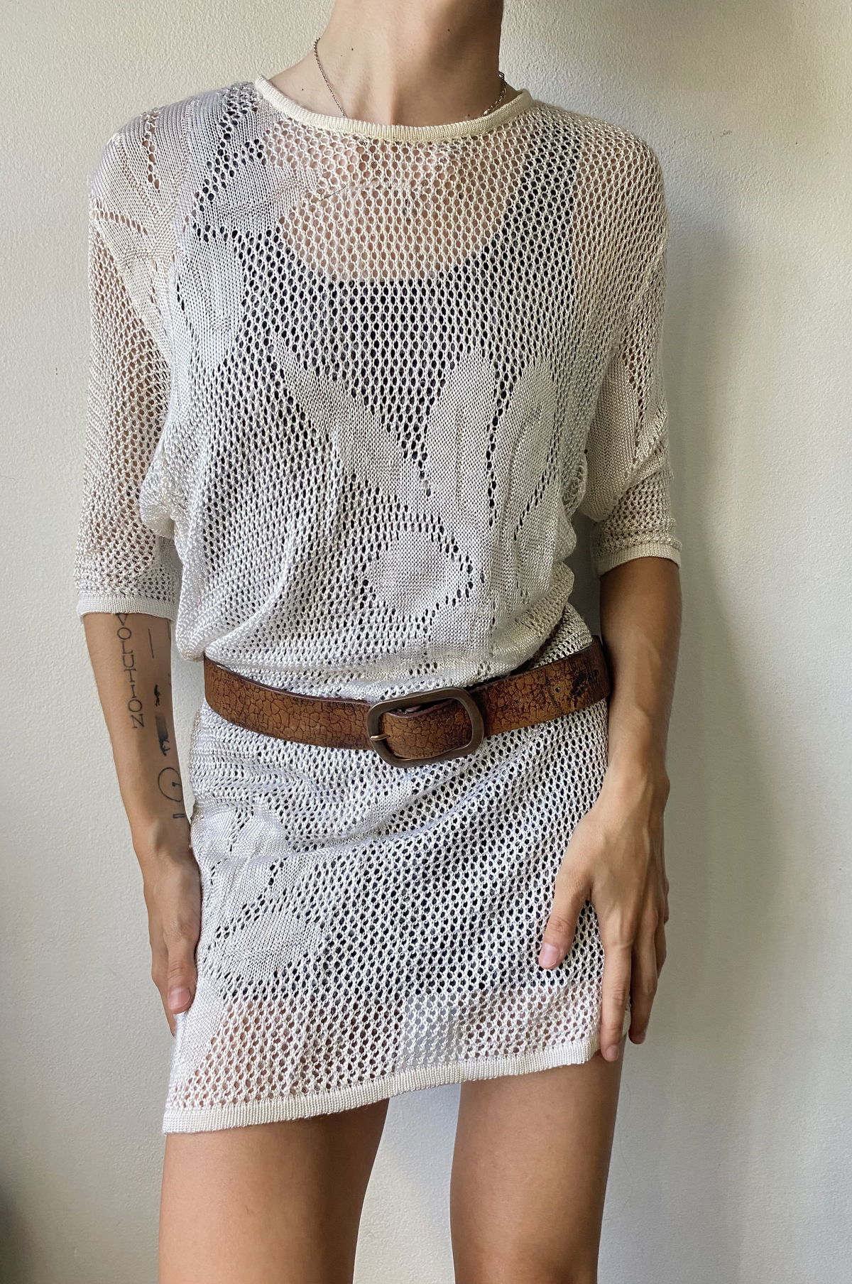Vestido de hilo color crema, manga tres cuartos con tejido de flores en algunas partes. Suelto y cómodo, la tela no pica, ideal para usar con bikini.