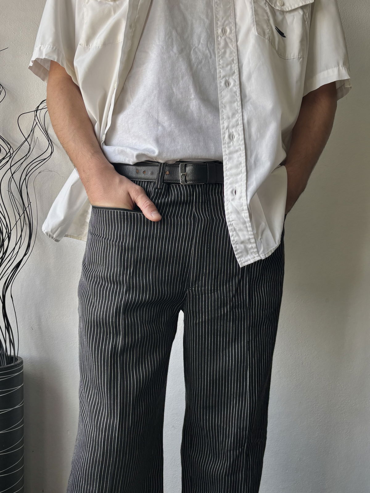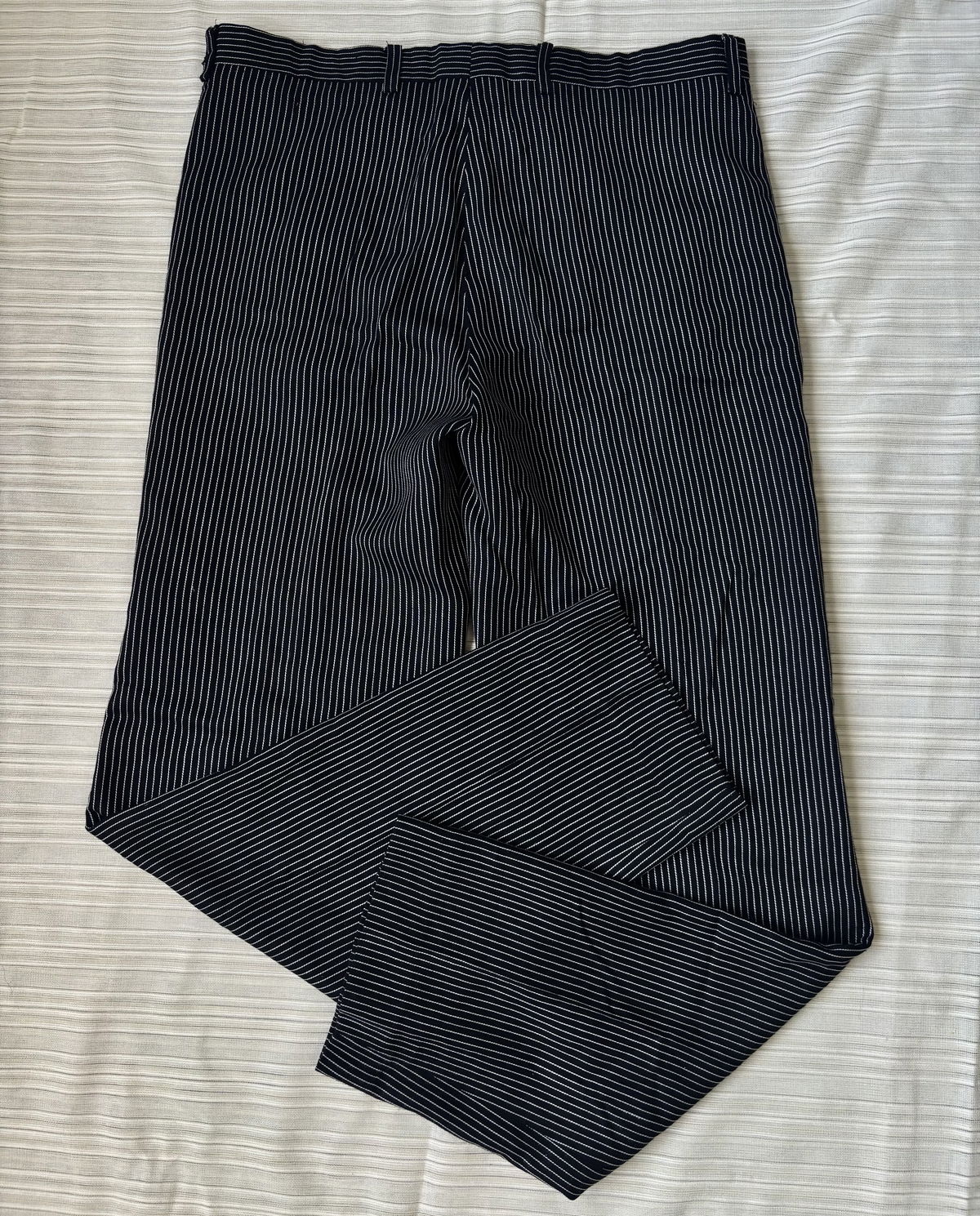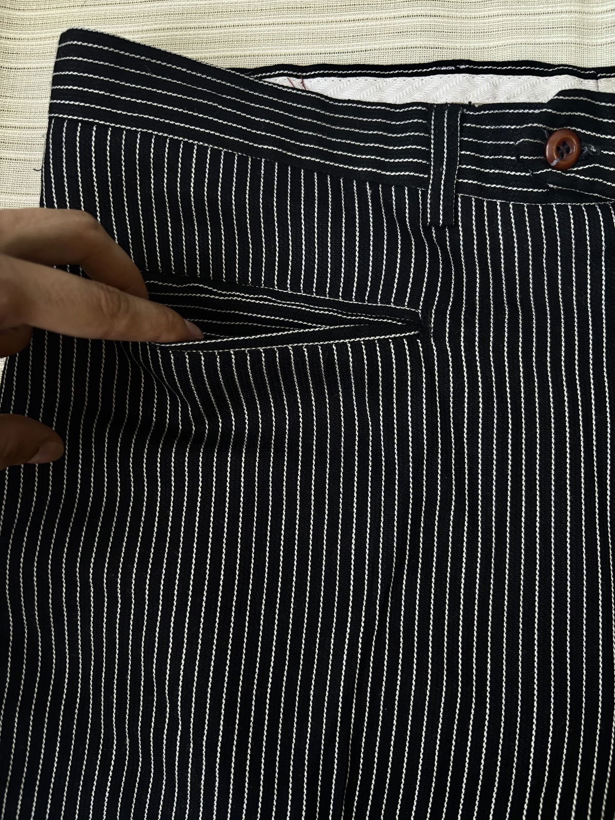Pantalón sastrero negro con rayas blancas, estilo lino con doble bolsillo adelante y pasacinto. No posee bolsillos por detrás, talle 44.
