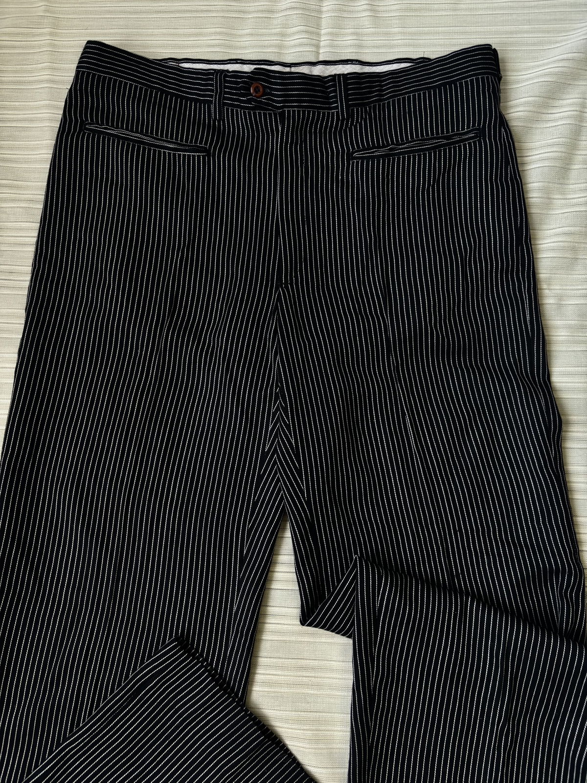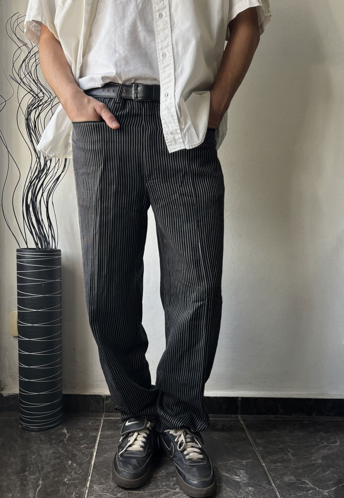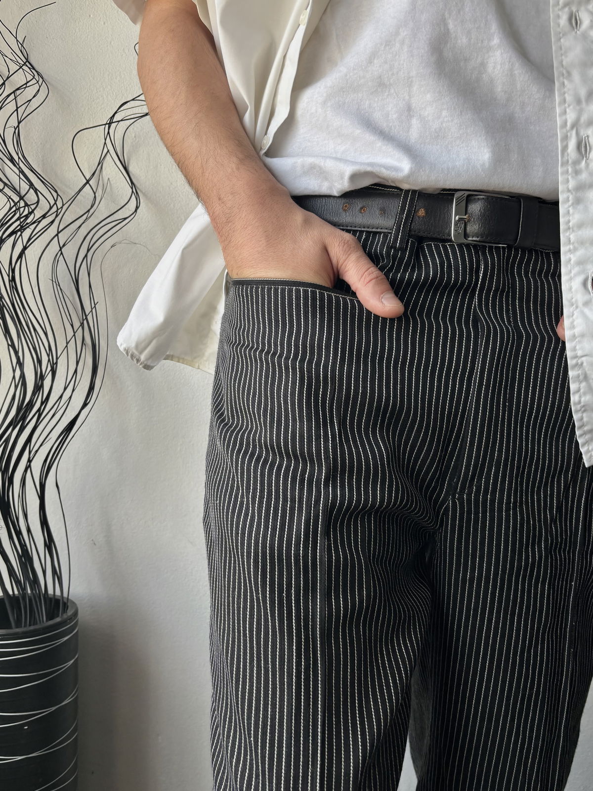 Pantalón sastrero negro con rayas blancas, estilo lino con doble bolsillo adelante y pasacinto. No posee bolsillos por detrás, talle 44.