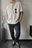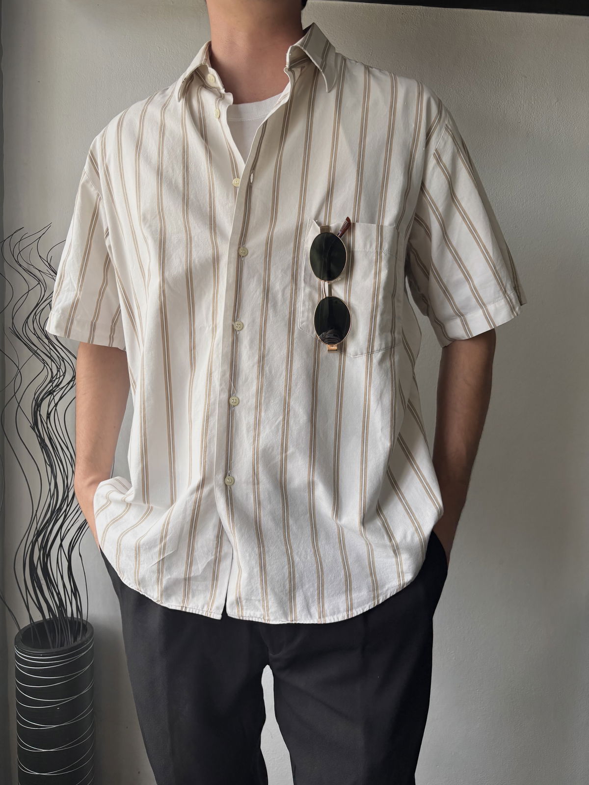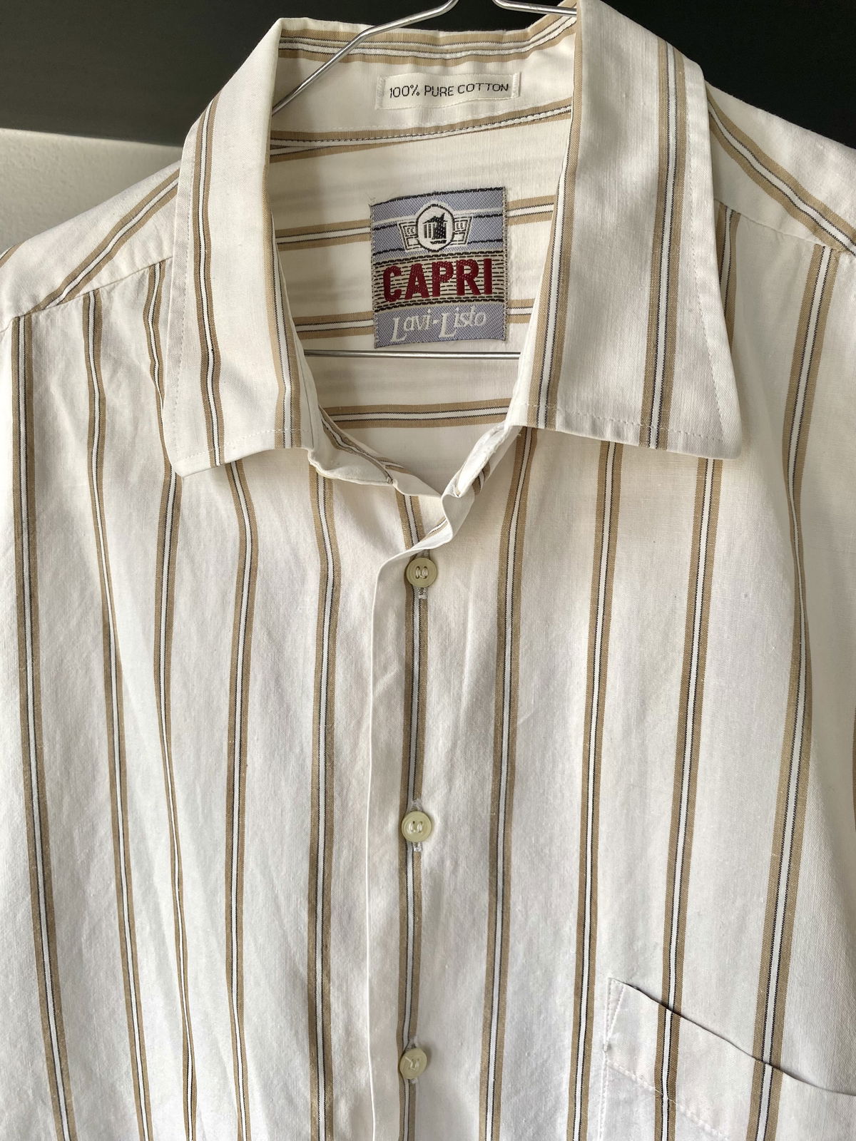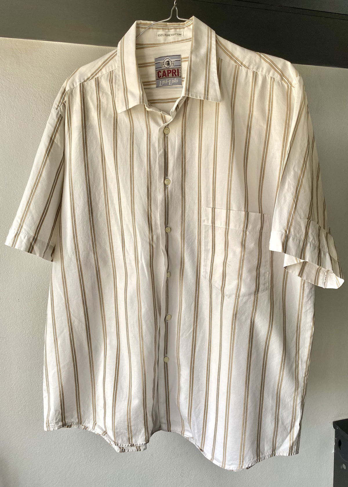Camisa marca Capri color crema, con rayas en color nude y bolsillo a un lado. Talle L, bastante oversize por su corte pero no tan larga.