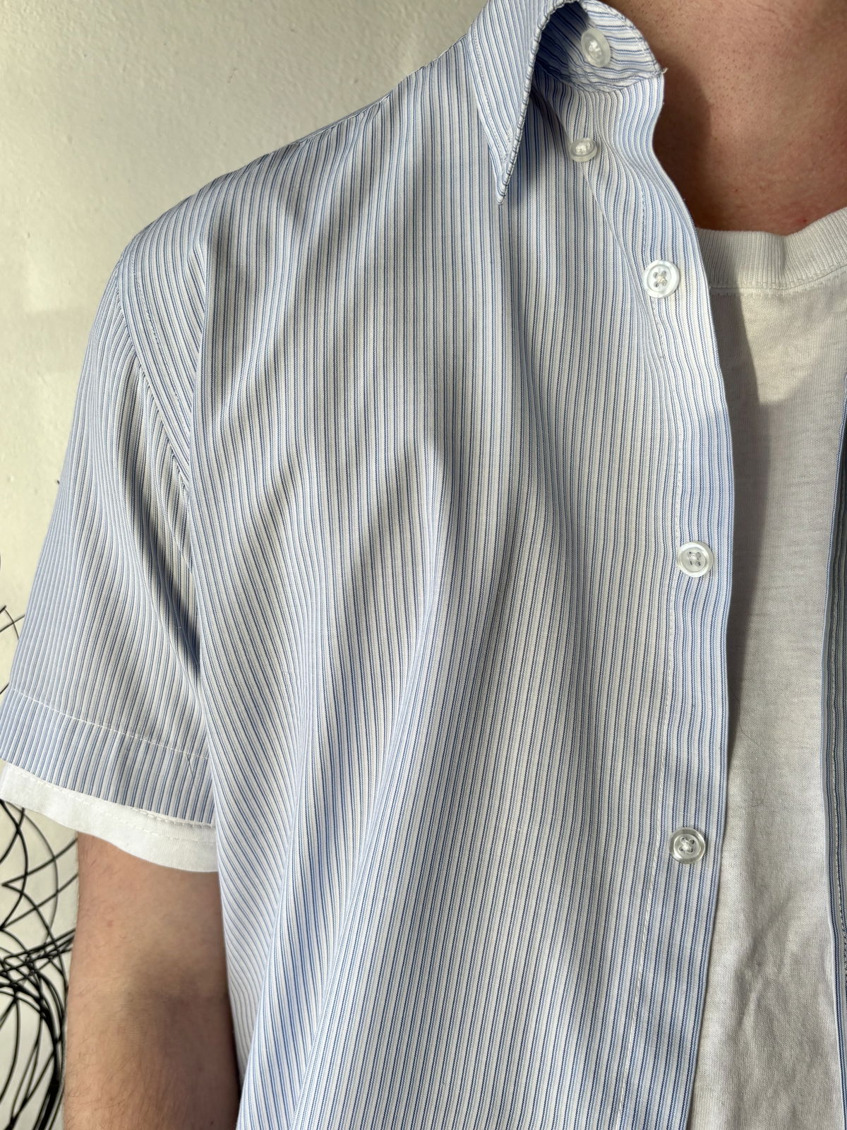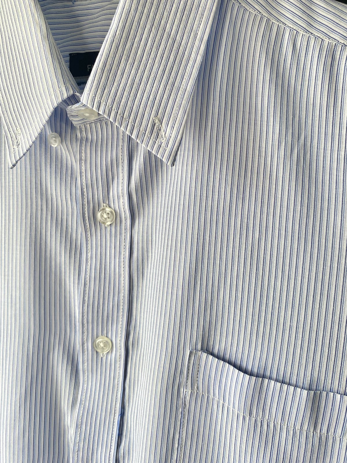 Camisa marca Furest, rayada color celeste, azul y blanca con bolsillo a un lado. Talle S/M es bastante angosta.