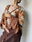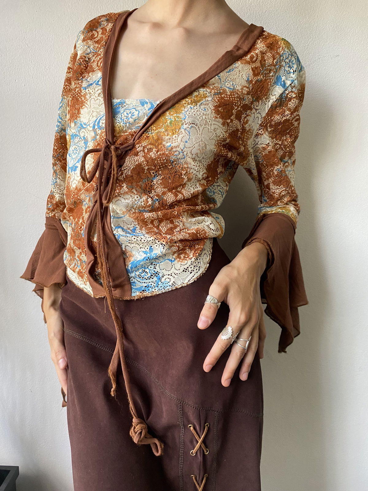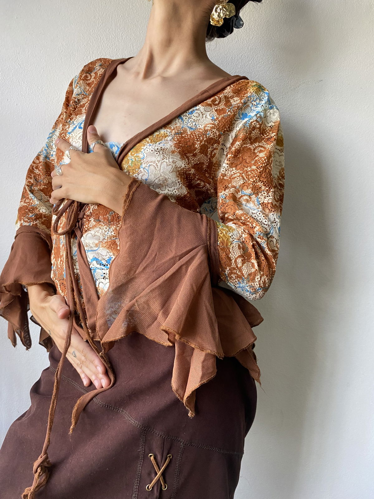 Blusa de encaje con mangas en picos color chocolate y tiras para ajustar en la parte delantera. Súper linda y cómoda, la tela no molesta y cede un poco.