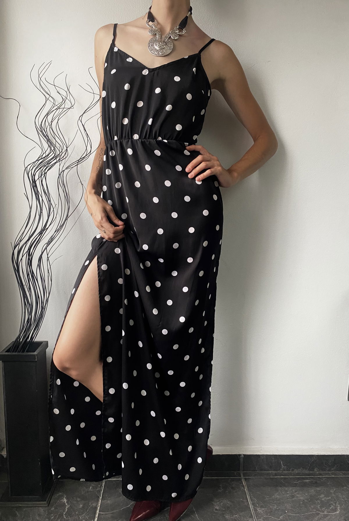 Vestido con estampado polka dots color negro y blanco, con tiras regulables y elástico en la cintura. Tiene un tajo al costado, súper fresco.