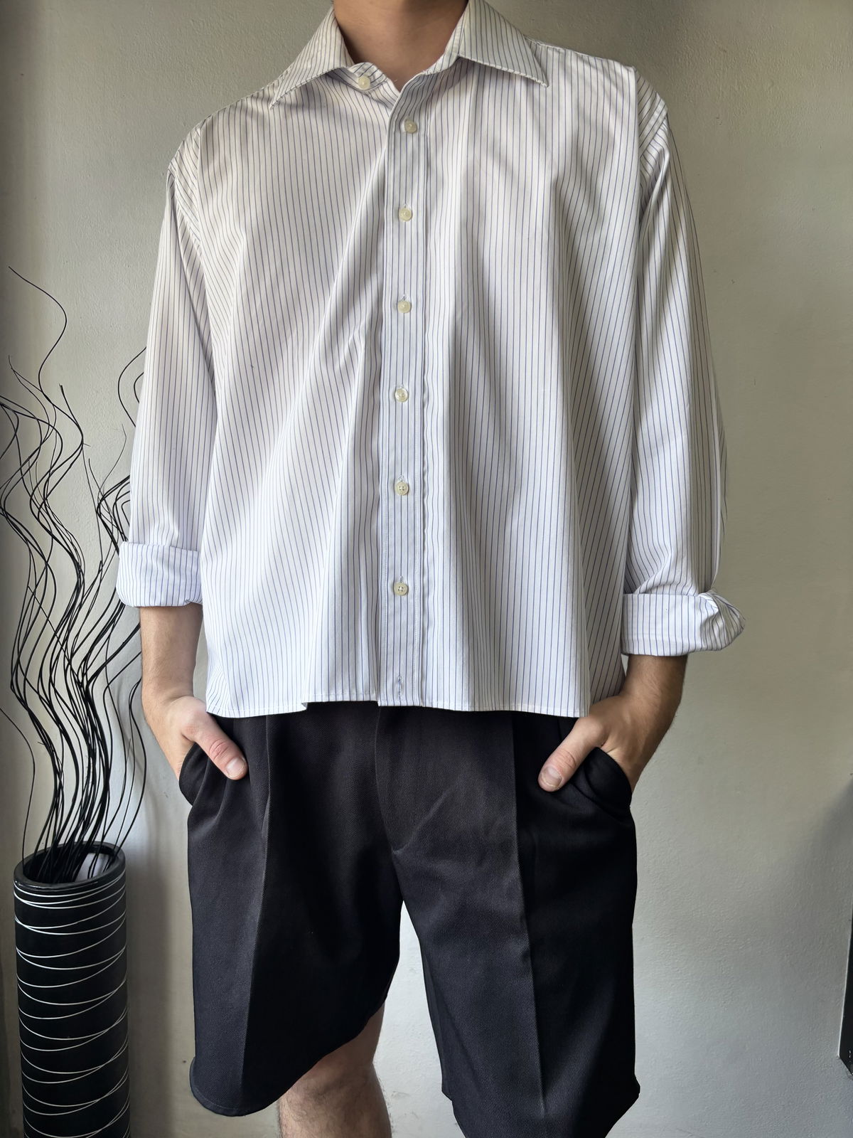 Camisa marca Harrys & Frank, color blanca con finas lineas en azul, manga larga. Tagg DEX en la espalda y corte boxy. Talle L