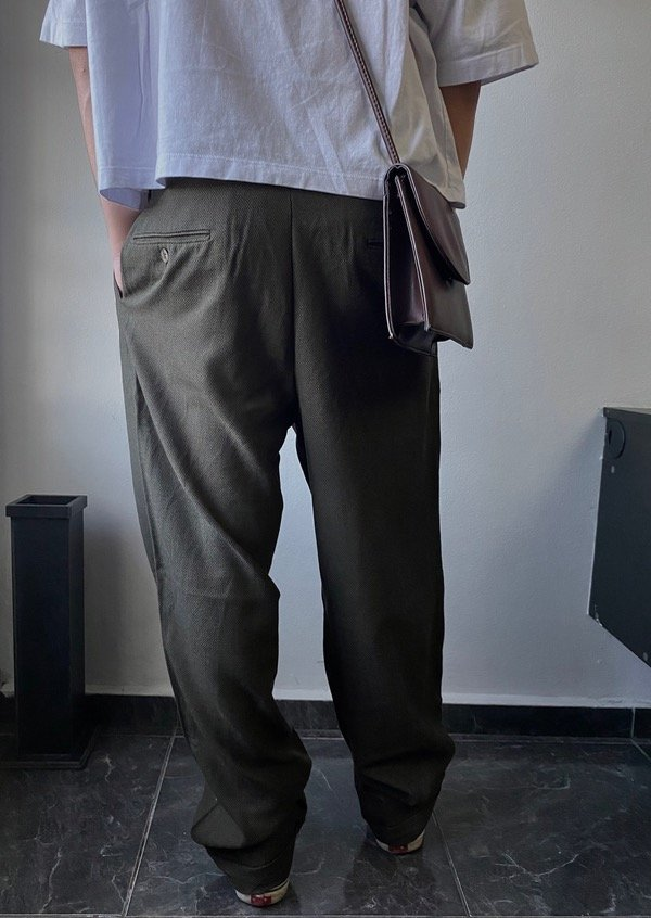 Pantalón sastrero tramado color verde oliva, abrigado con bolsillos en la parte delantera y trasera y pasacinto. Talle 44