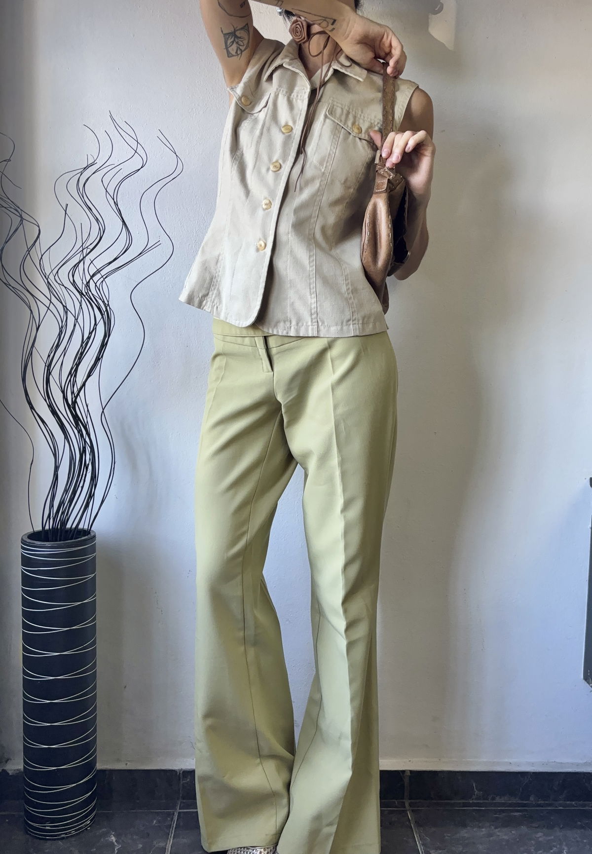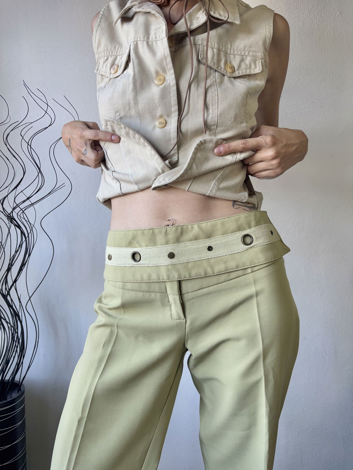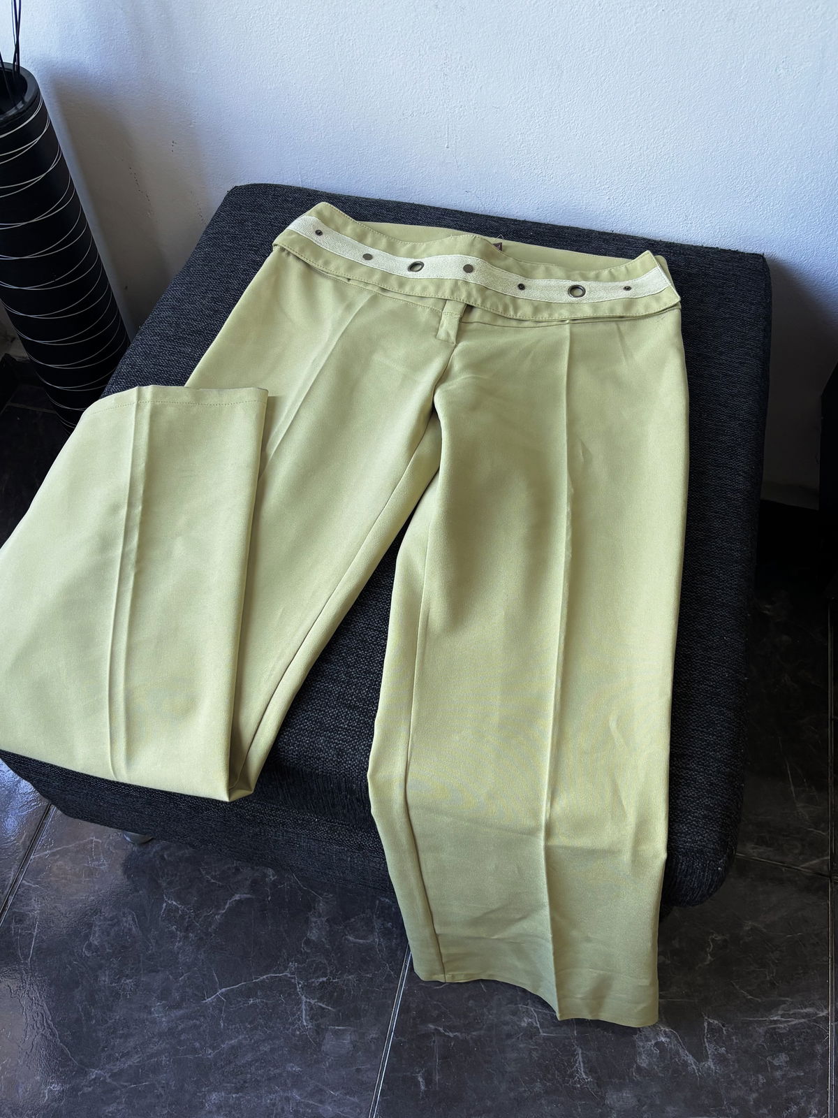 Pantalón sastrero color verde manzana, tiro medio/bajo con cintura con ojales y círculos metálicos en color bronce. Sin bolsillos, ni pasacinto. Talle 40