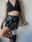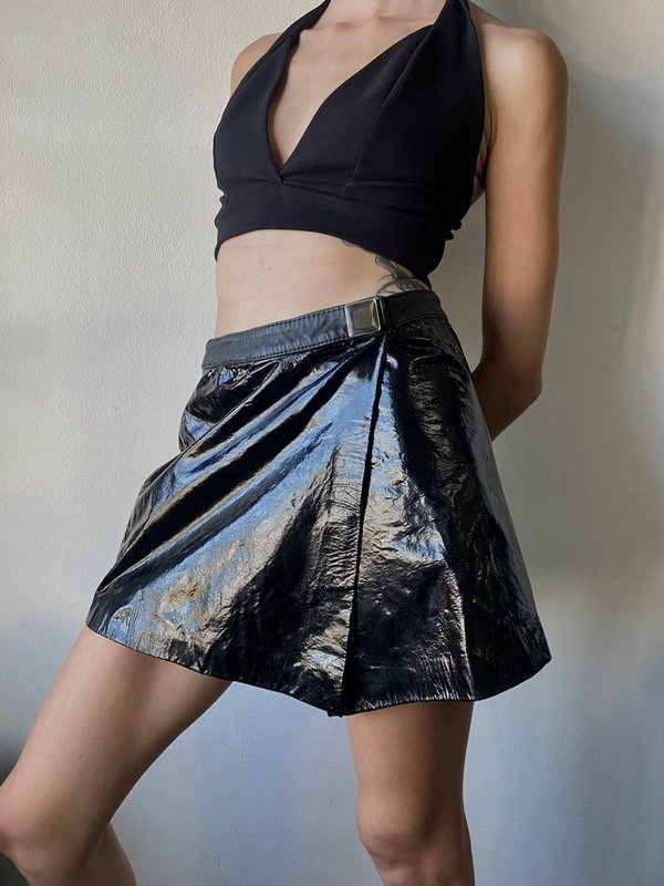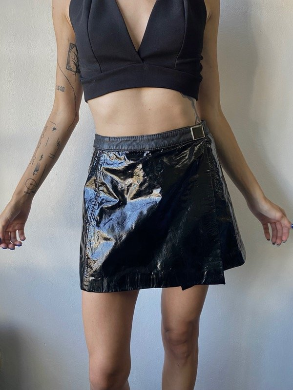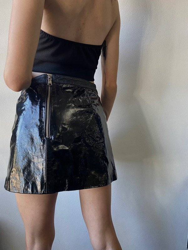 Pollera de charol color negro, forrada por dentro y cintura de cuero. Con botón simulando una piedra de adorno y cierre en la parte trasera. Doble solapa, talle 36