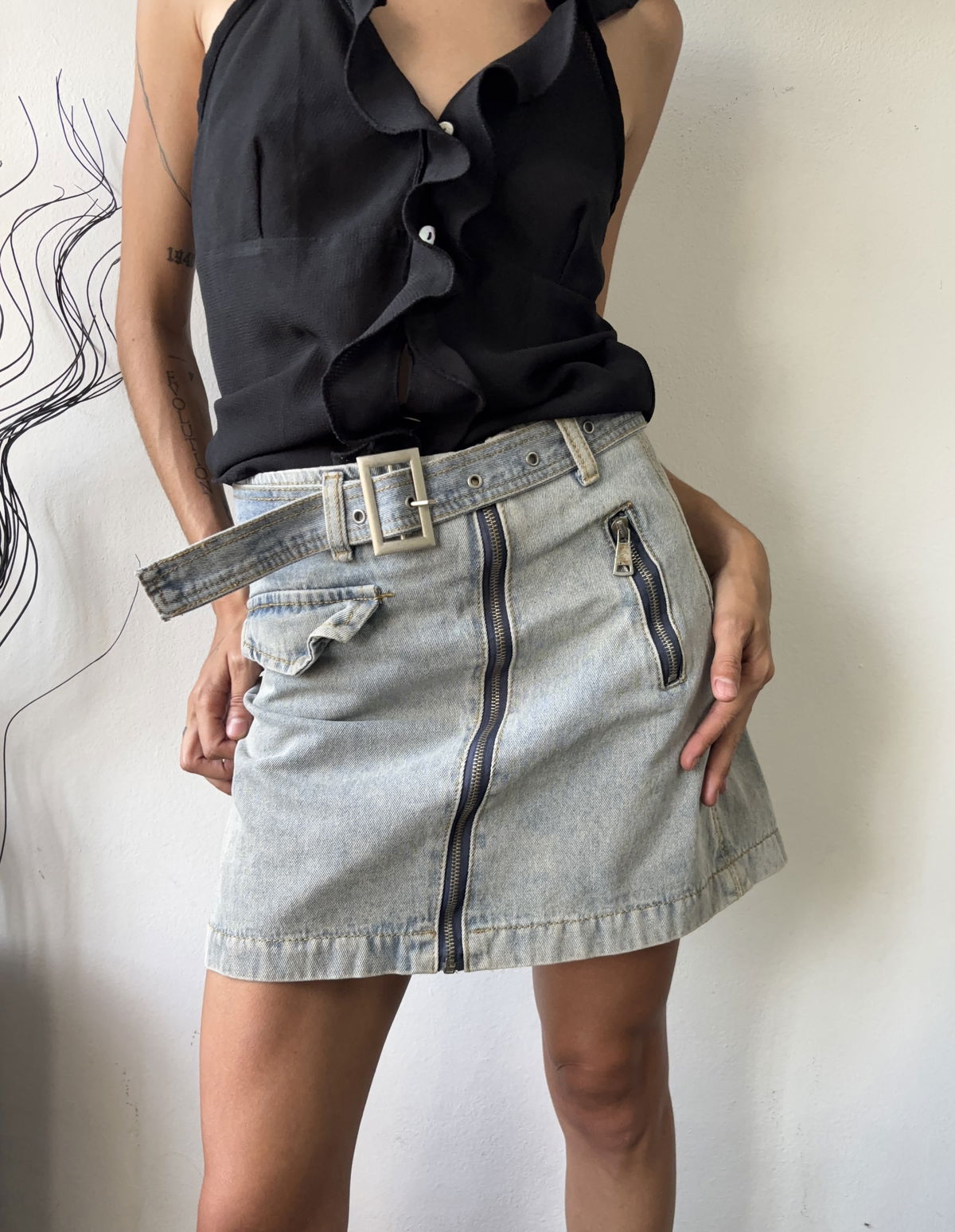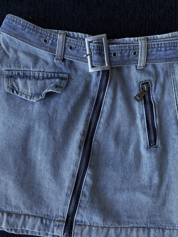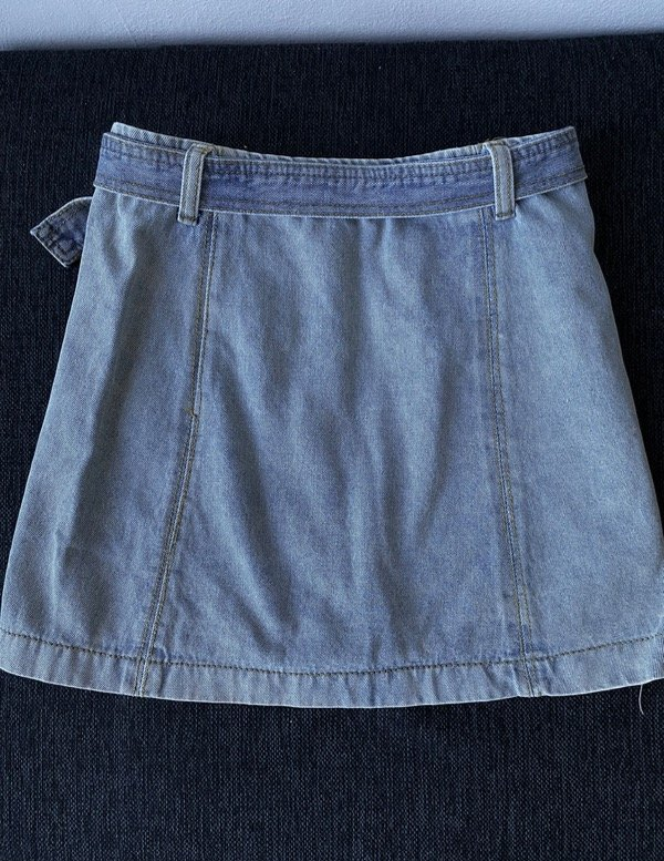 Pollera de jean color celeste muy clarito, con cierre metalico y cinto incluido. Talle 36