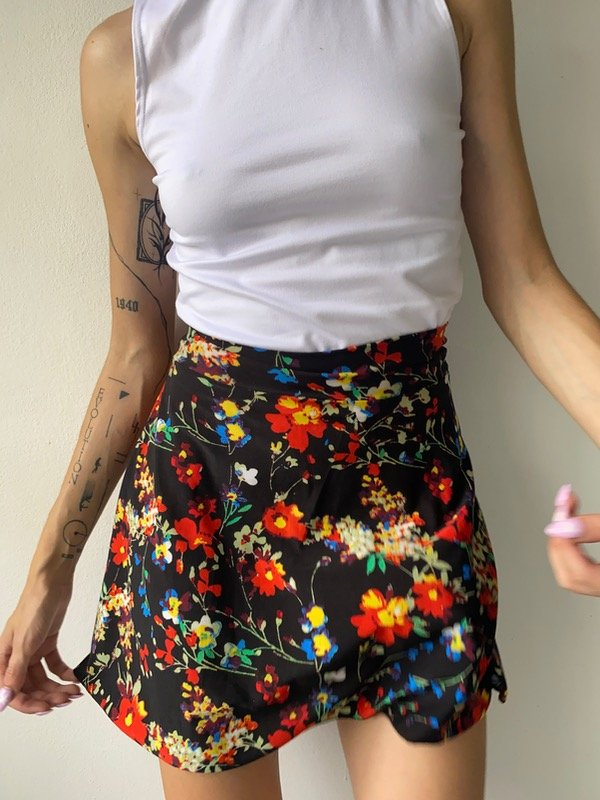 Pollera de lycra fria con estampado de flores en distintos colores. Elastizada