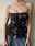 Top estilo corset, con frunce y elástico en el busto. Doble volados en la terminación y dibujo de hojas en gris y algunas con brillos. Cede del talle 1 al 2