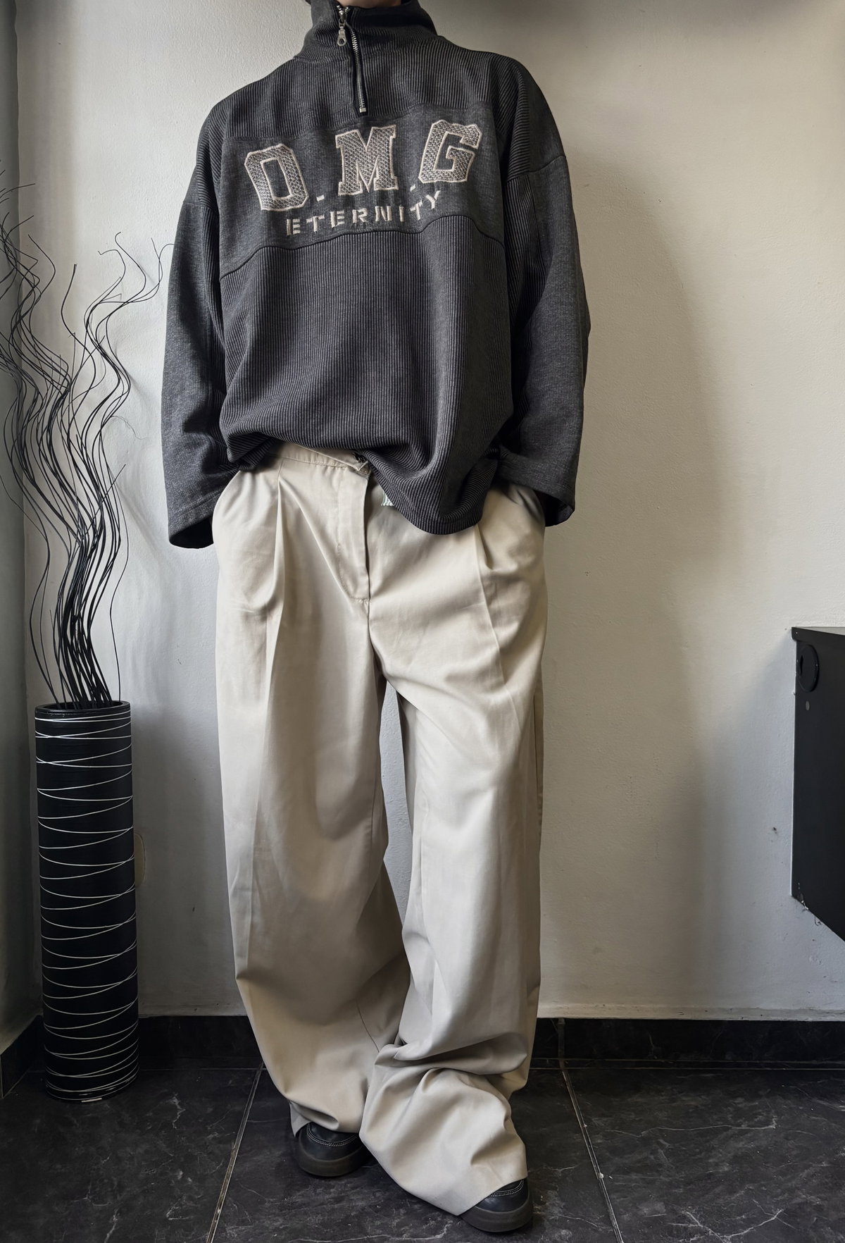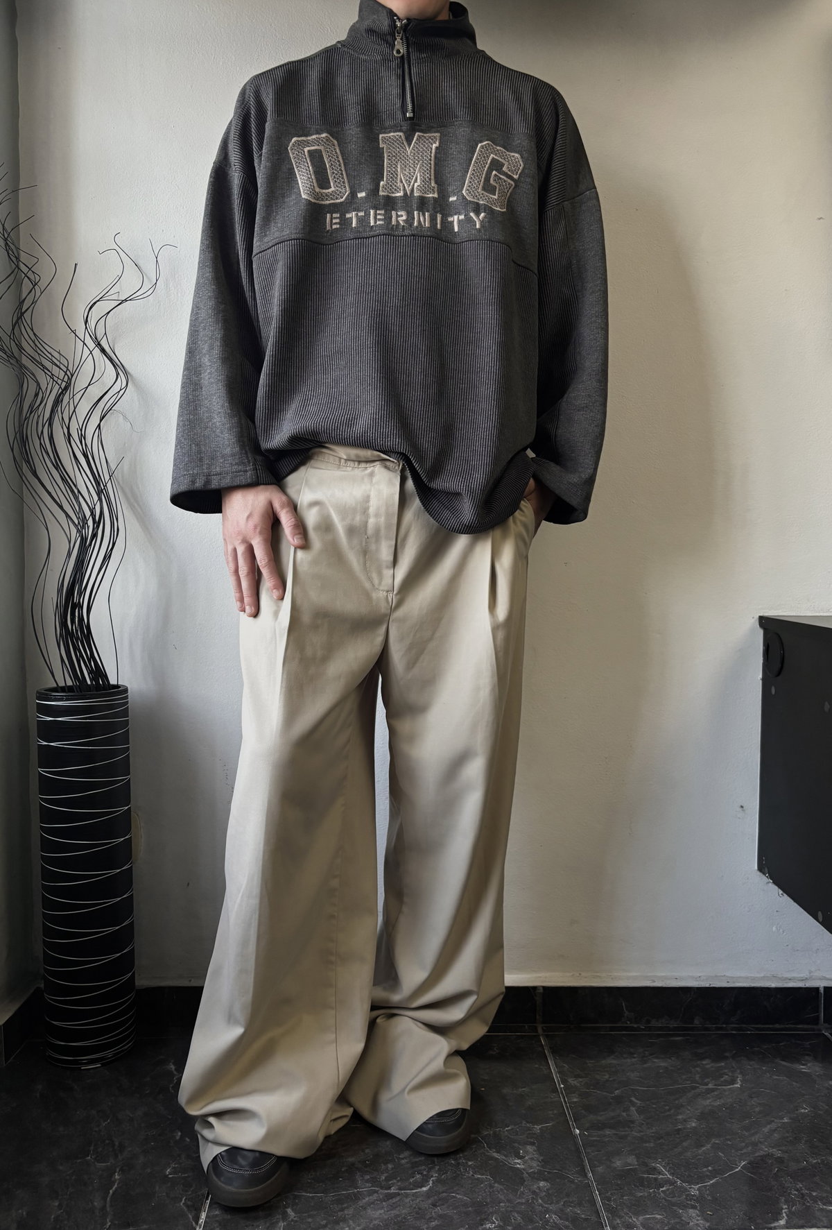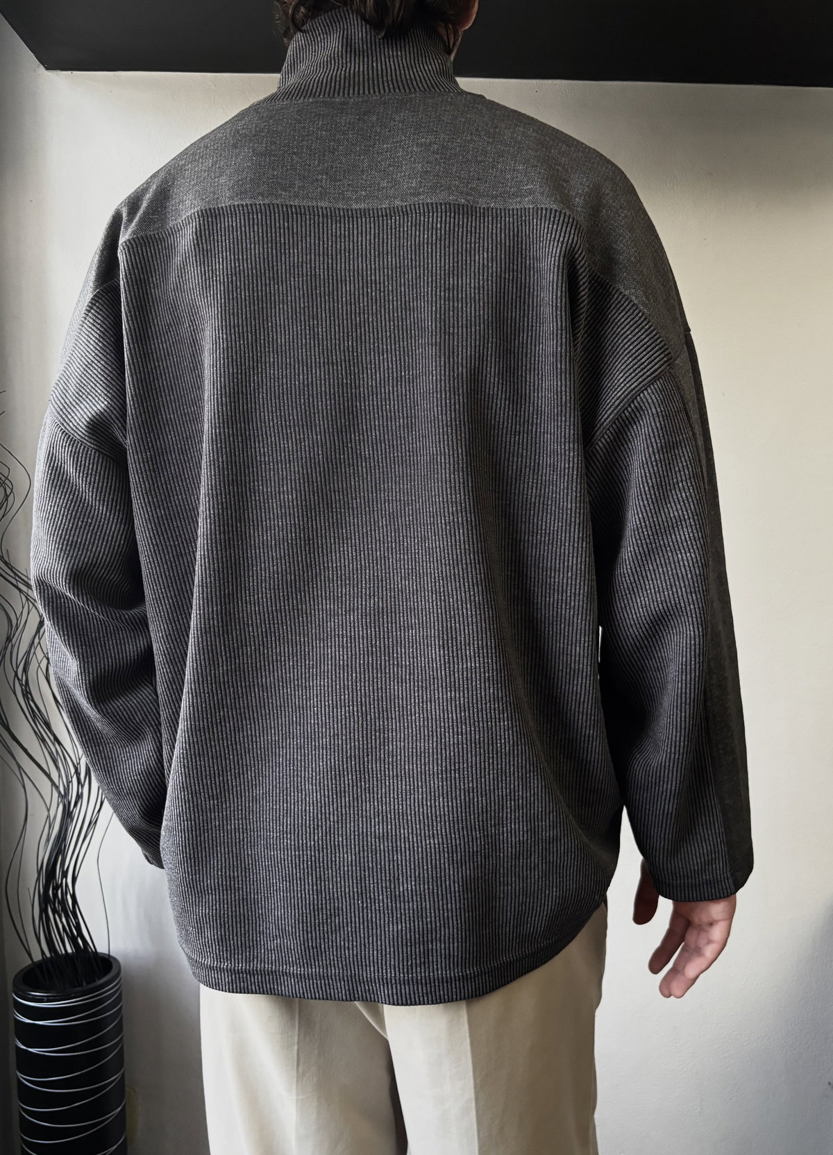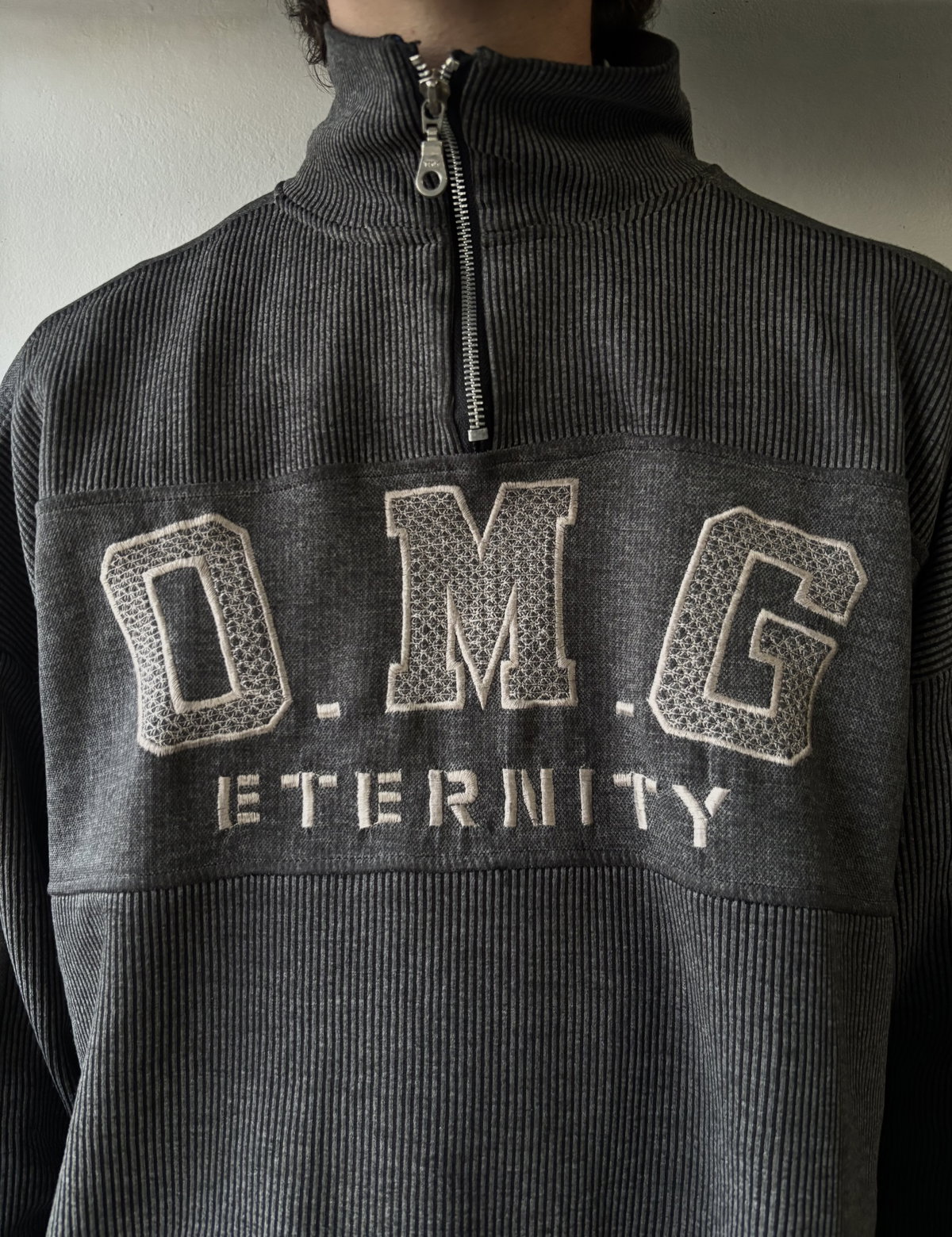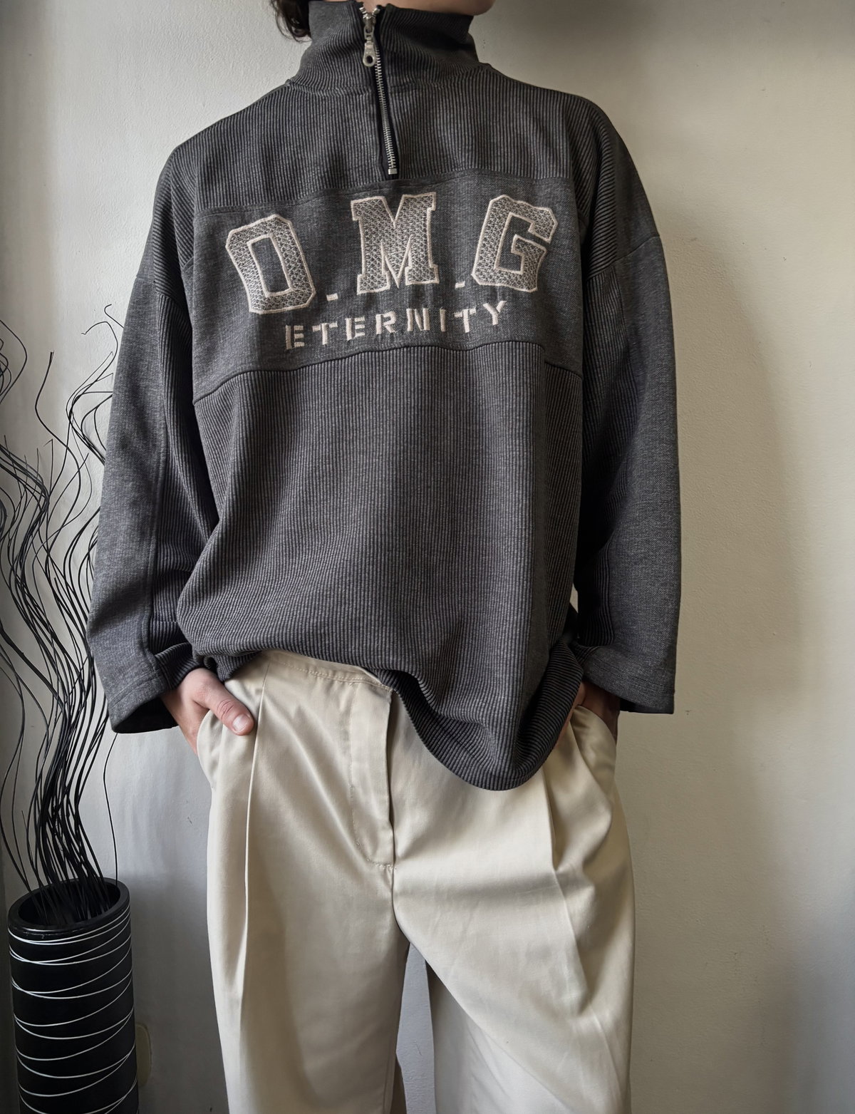 Suéter gris con bordado en el frente y cuello alto con cierre para usar como polera o como chomba. Corte oversize, con mangas caídas, talle L