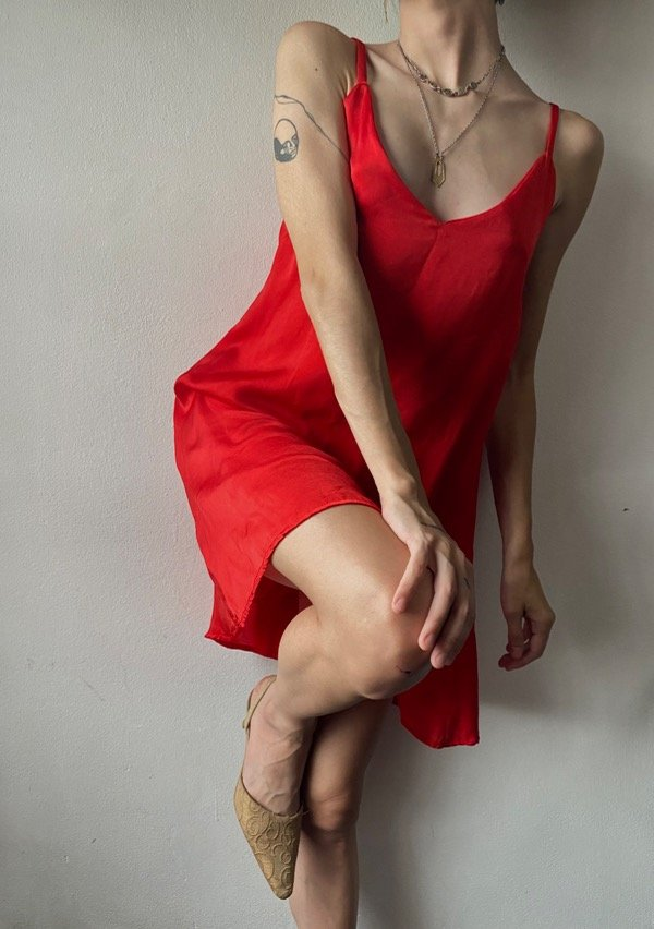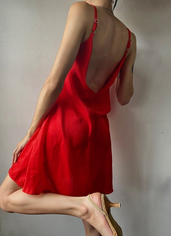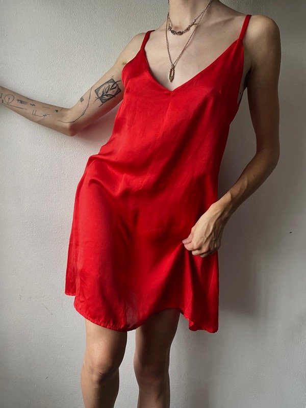 Vestido marca Chantal de seda color rojo fuerte, con escote en V y espalda descubierta. Con bretteles regulables, lo ajustas como te quede mas comodo.