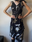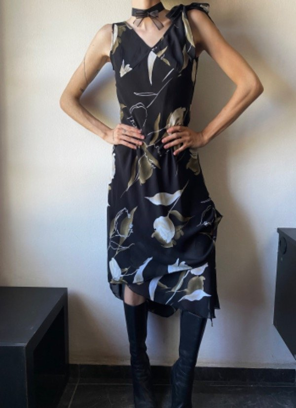 Vestido largo de flores y hojas color blanco y verde, con escote y espalda en V y frunce para ajustar a un lado. Tiene lazo en un lado del hombro, súper fresco y forrado para que no se transparente nada.